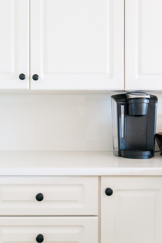 대리석 상판 교체와 함께 싱크대 서랍장의 투명한 색으로 되어 있었던 손잡이들을 매트 블랙 손잡이로 바꾸고 냉장고 손잡이도 매트 블랙 스프레이로 도색해서 깔끔하게 포인트를 주었다.