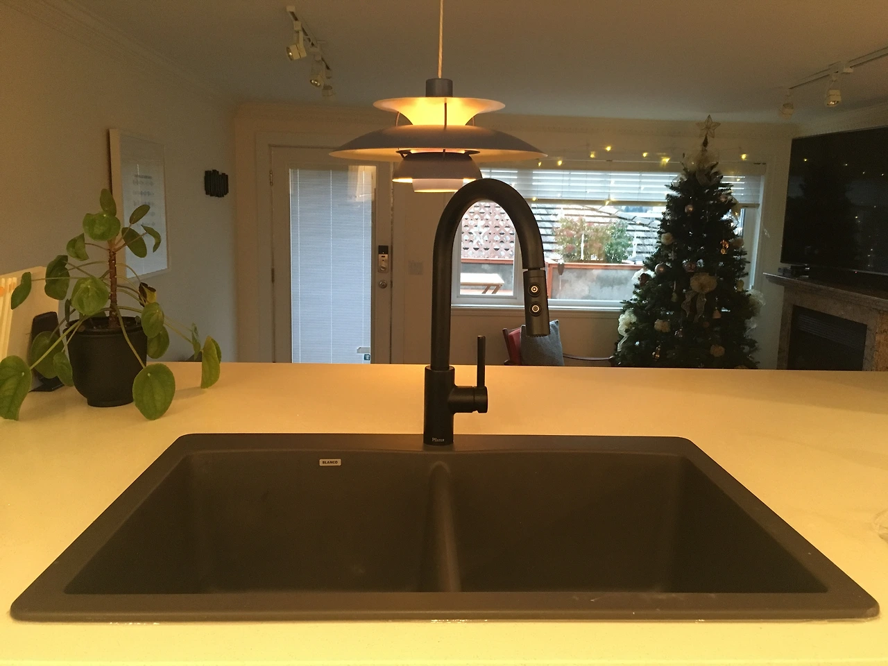 천정 매립등 안쪽에 금색으로 되어있는 전등 갓도 통일성을 위해 다 매트 블랙으로 다시 도색했다. 그리고 요리사인 신랑이 고른 매트한 회색의 신소재로 된 개수대와 매트 블랙으로 된 수도꼭지를 설치했다.