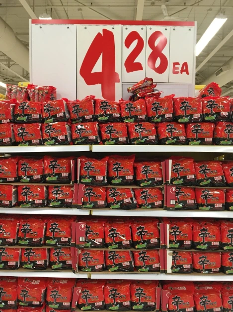 월마트에 가면 미대륙 내에서의 한국 라면 인기를 제일 실감할 수 있다. 월마트에서는 미국에서 만들어진 농심 라면들이 가끔 물건이 없어 못 살 정도로 잘 팔리고 있다. 이민 오기 전 교포인 신랑한테 캐나다에 살 때 한국음식이 뭐가 제일 그리웠었는지 물어보니 의외로 라면이었다. 그리고 이곳에 와보니 왜 라면인지 바로 실감했다. 캐나다에는 라면이 한국에서 수입이 되기 때문에 유통기한이 일 년 가까이 되고 오래된 라면에 많아서 맛이 없다. 한 번은 한국 마트에서 라면을 사서 끊였더니 오래된 기름 냄새 때문에 한입도 먹지 못하고 버리고 말았다. 하지만 미 대륙 내의 한국 라면 인기 덕분에 몇 년 전 농심 공장이 미국에 생겨서 월마트나 거의 모든 마트에서 미국에서 만든 신라면 살 수 있게 되었다고 한다. 월마트에는 신라면 외에도 채식을 즐기고 매운 것을 먹지 못하는 백인들은 대상으로 만든 맵지 않은 야채라면과 짜장라면 등 비교적 많은 종류를 팔고 있다.
