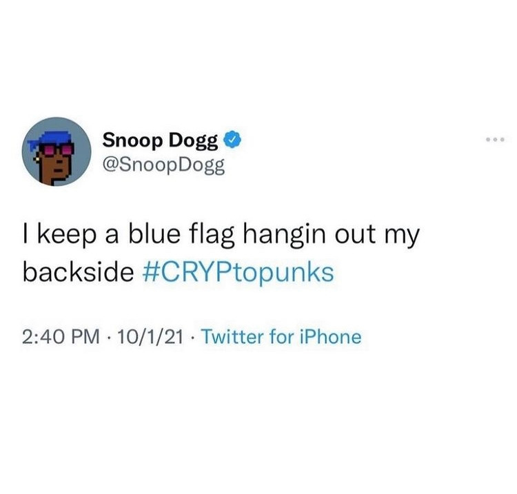 유명한 미국 농구 선수 스테판 커리에 이어서 레퍼 스눕독(Snoop Dogg)도 자신의 이미지와 비슷한 크림토펑크(Cryptopunks)의 NFT 파일을 59억(약500만불)에 구매한 뒤 자신의 트위터 이미지로 사용하고 있다고 한다. 게다가 그는 얼마 전 자신이 약 200억이 넘는 NFT 작품들을 가지고 있는 코스모 드 메디치(Cozmo de Medici)가 자신이었다는 것을 자신의 트위터를 통해 알리면서 화제가 되었다.