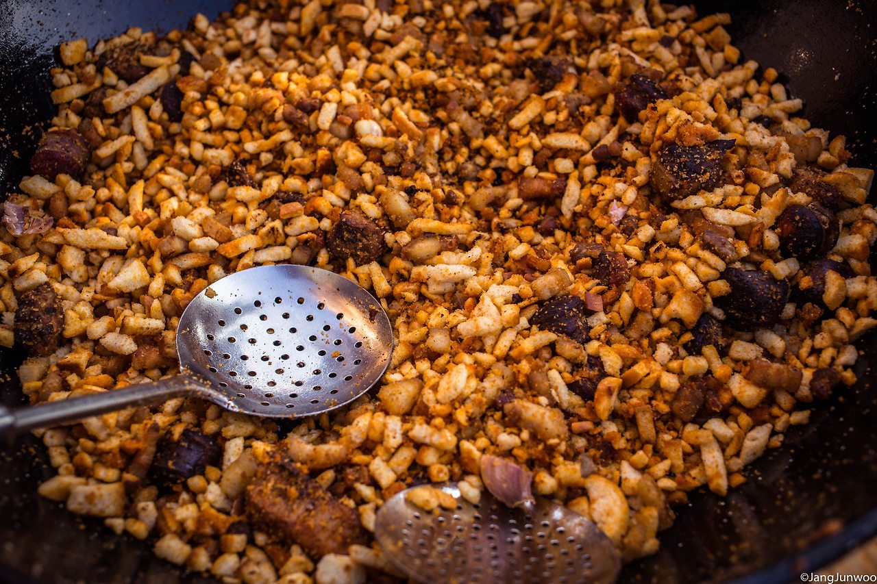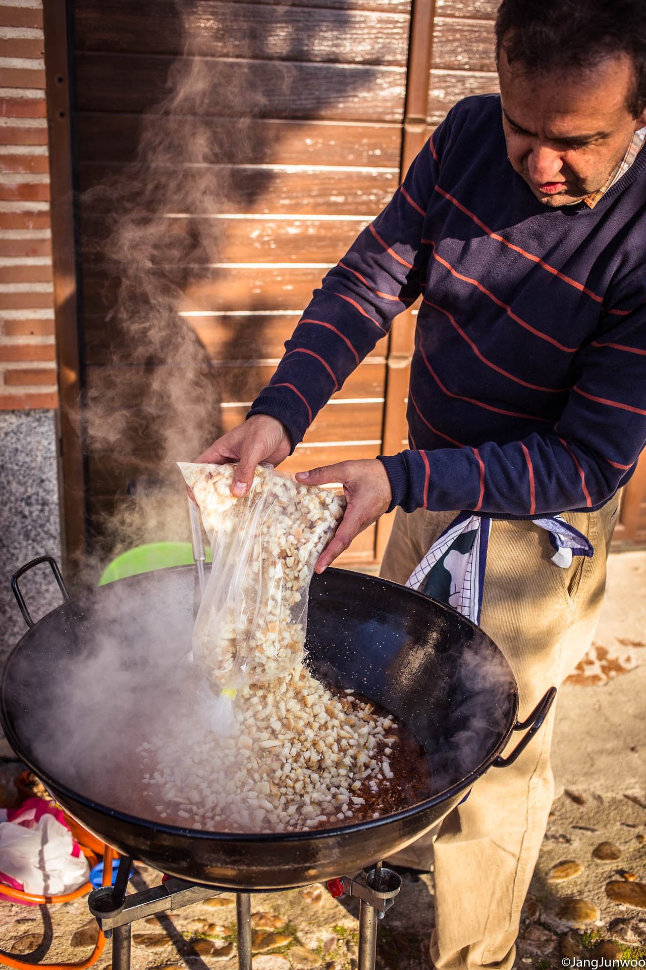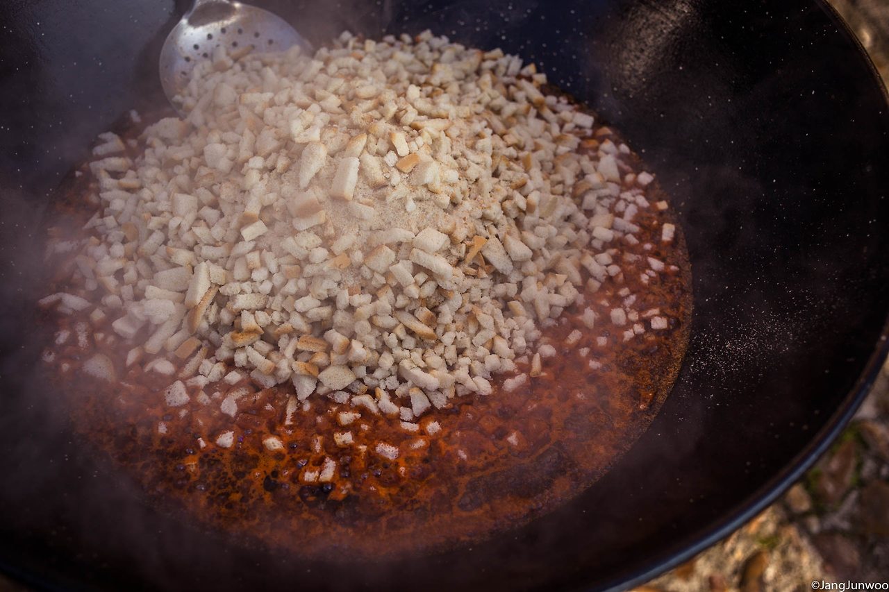 그날은 2016년의 마지막 날, 스페인의 고도(古都) 톨레도를 가로질러 흐르는 타호강의 알칸타라 다리를 향해가던 중이었다. 길가에 한 무리의 사람들이 옹기종기 모여 먹고 마시고 있는 장면이 눈에 들어왔다. 커다란 냄비 두 개가 길 위에 놓여 있고 냄비 안에선 무언가가 만들어지고 있었다. 늘 그래 왔듯 호기심에 음식 앞으로 바짝 다가가 내용물을 살폈다.