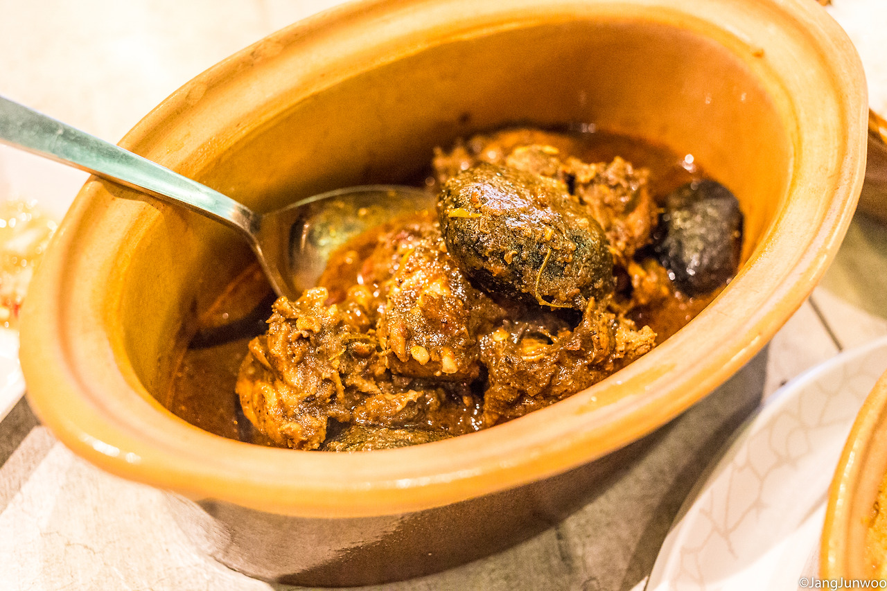 아얌 부아 켈루악 Ayam Buah Keluak도 무척 흥미로운 요리다. 블랙 너트, 풋볼 프루트로 알려져 있는 부아 켈루악의 속과 다진 고기, 향신료를 섞어 만든 페이스트를 껍질 안에 넣은 후 닭과 함께 좋인 치킨 스튜의 일종이다.