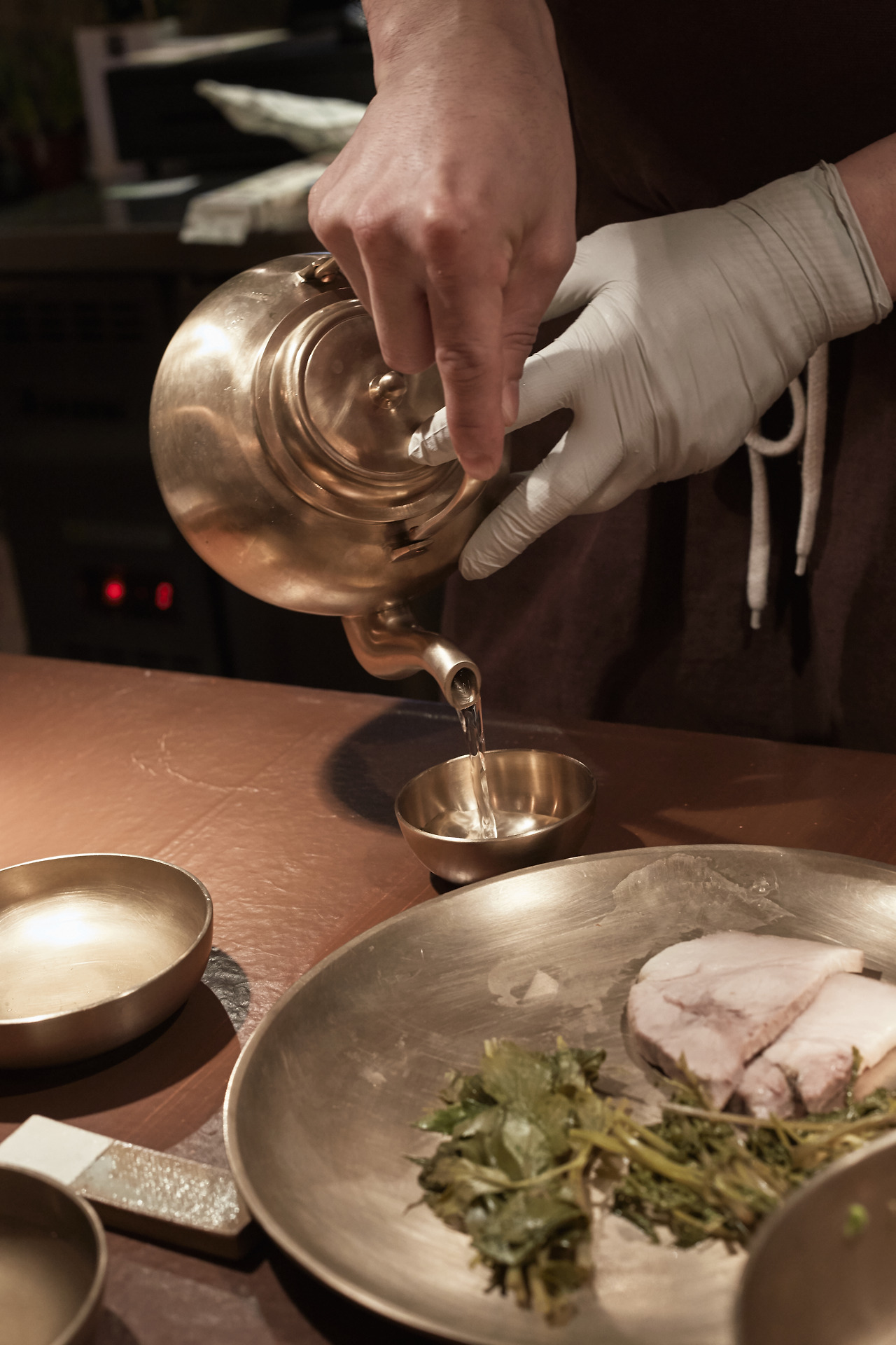 이렇게 나온 돼지 곰탕은 묵직한 놋그릇에 담긴다. 뜨겁지 않고 먹기 좋은 온도로 나온 곰탕이 빠르게 식지 않게 하기 위해 하나에 수만 원을 호가하는 거창 유기 놋그릇을 쓴다. 한 그릇을 비울 때까지 그릇은 온기를 유지하고 있다. 셰프의 의도대로 0.8%의 염도를 정확하게 지킨 국물의 간은 더할 것도 뺄 것도 없다. 의도한 맛의 최적의 상태로 손님에게 내는 것. 요리하는 사람의 고집이 엿보이는 대목이다.