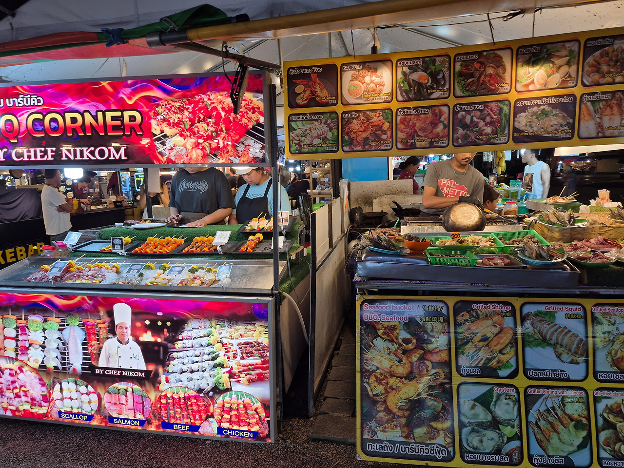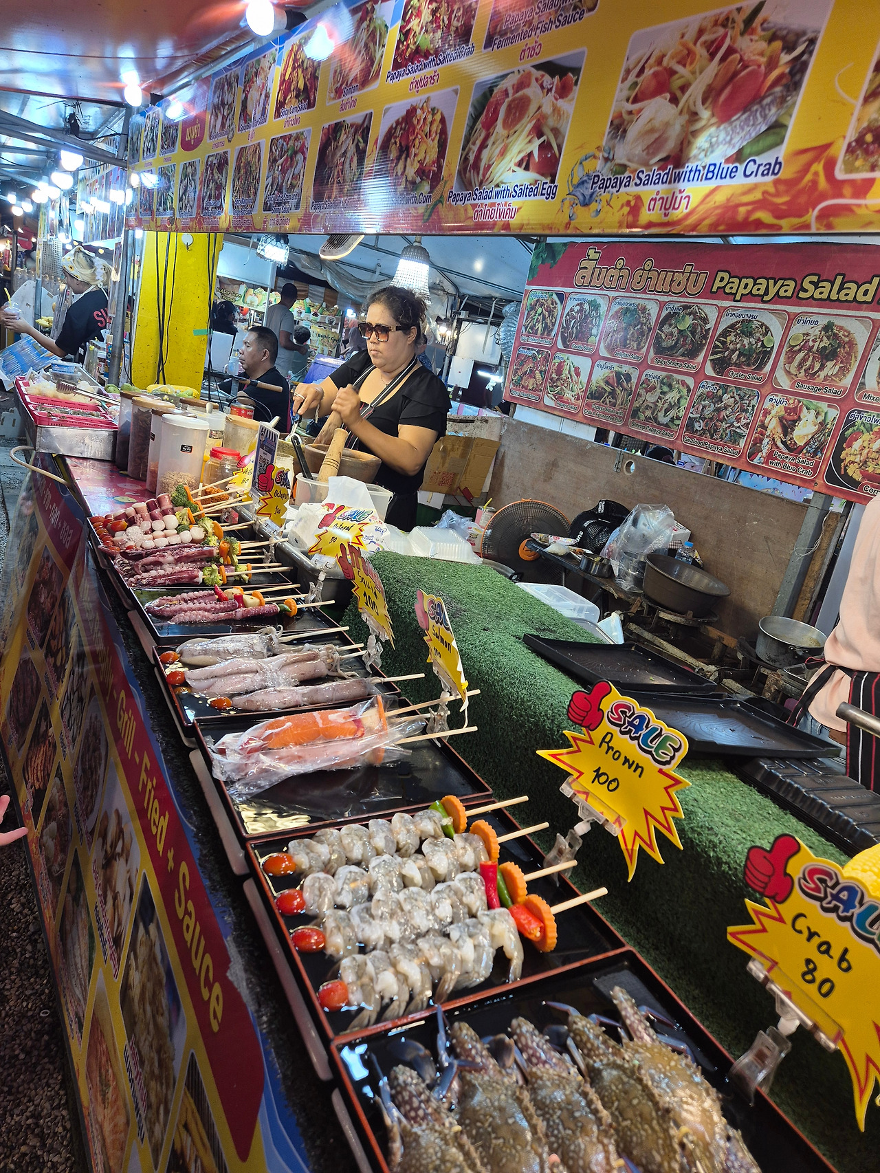 야시장은 바닷가 도시 크라비답게 해산물 요리의 향연이 펼쳐져 있었다. 여기저기서 들려오는 지글지글 소리와 군침 도는 냄새는 어떤 음식을 고를지 한참을 망설이게 만들었다.