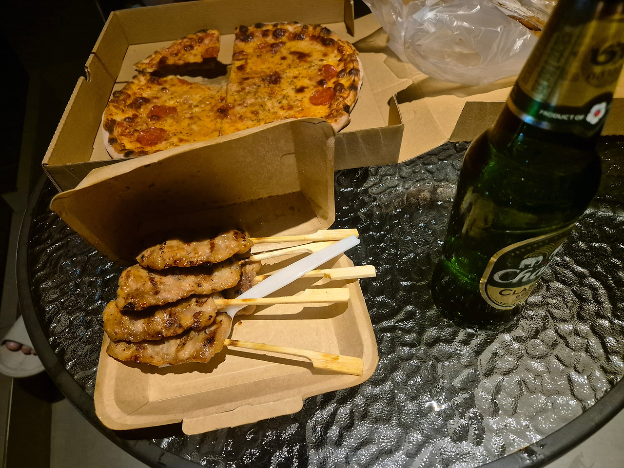 우리는 태국의 대명사와도 같은 수박주스, 땡모반과 무삥을 사고, 주문해 두었던 피자를 픽업하여 숙소로 복귀했다.