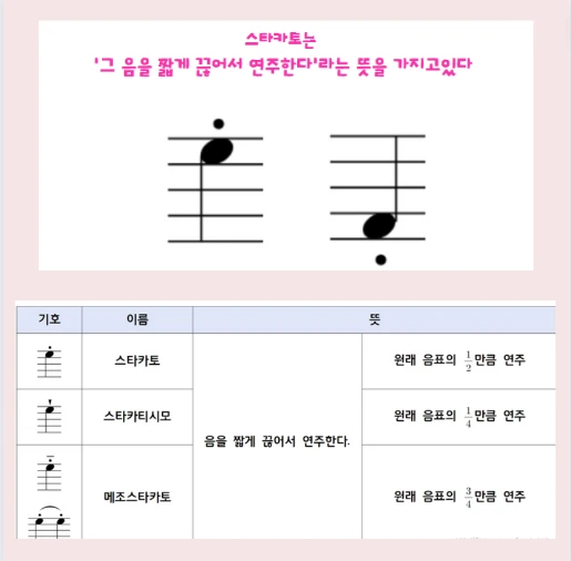 스타카토라~ 선희 어머님은 잠시 생각에 잠기셨다. 학교 때를 떠올리는 듯~ 난 잠시 웃음을 머금고 기다렸다. “원장님 그거~ 끊어서 치는 거요!” 기억이 나셨나 보다. “네 어머니 맞아요. 음을 끊어서 연주하는 거요” 잠시 설명하자면, 스타카토는 음악 악보에서, 한 음 한 음씩 또렷하게 끊는 듯이 연주하라는 말이고, 기호는 음표 위에 ‘점’을 찍는다. 음표 위에 점을 찍어 스타카토로 연주하라고 표시해 두는 기호이다. 선희가 스타카토를 기억하고 엄마에게 스타카토를 사 달라고 한 모양이다.