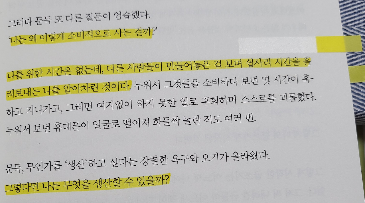나를 위한 시간은 없는데,다른 사람들이 만들어 놓은 걸 보며쉽사리 시간을 흘려버리는 나를 알아챘다.스테르담, 《나를 관통하는 글쓰기》
