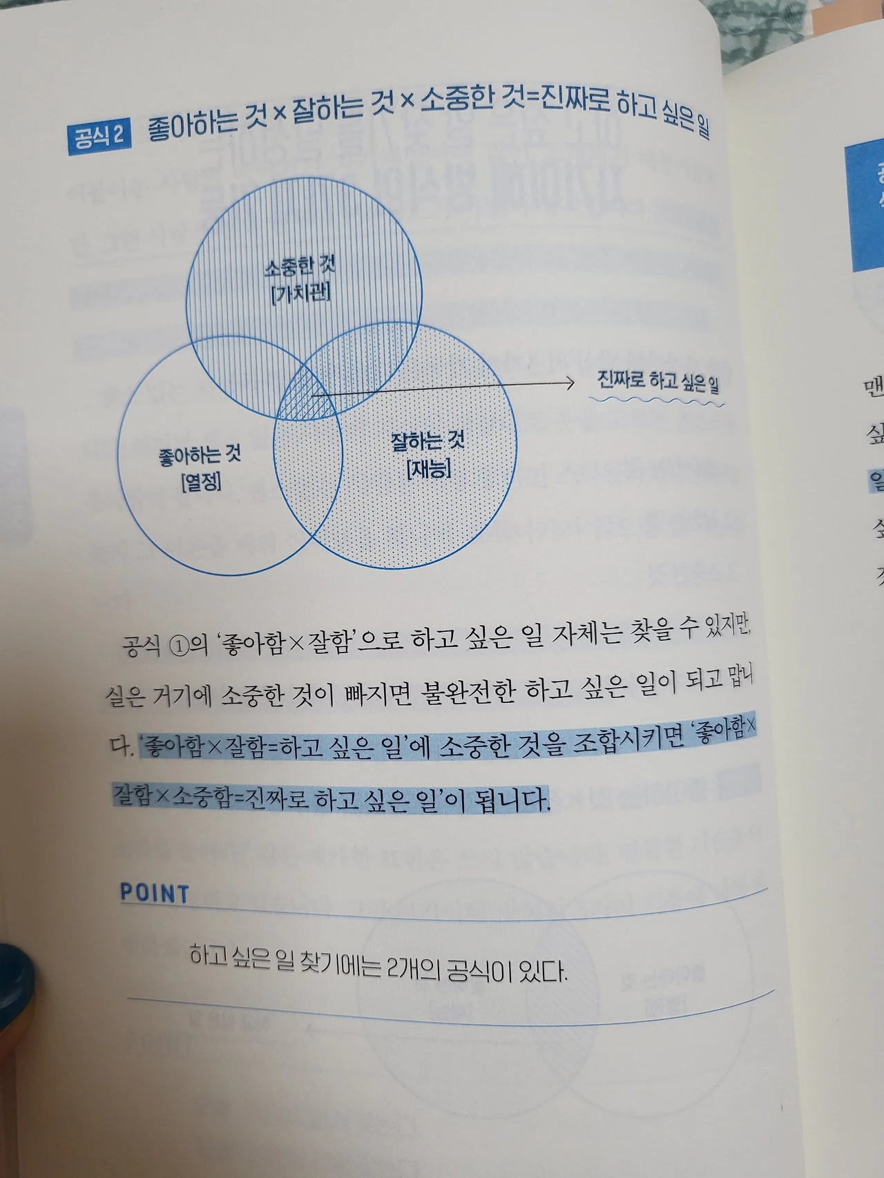 - 좋아하는 것 X 잘하는 것 = 하고 싶은 일: 좋아하는 것을 잘하는 방식으로 하는 것 - 좋아하는 것 X 잘하는 것 X 소중한 것 = 진짜로 하고 싶은 일