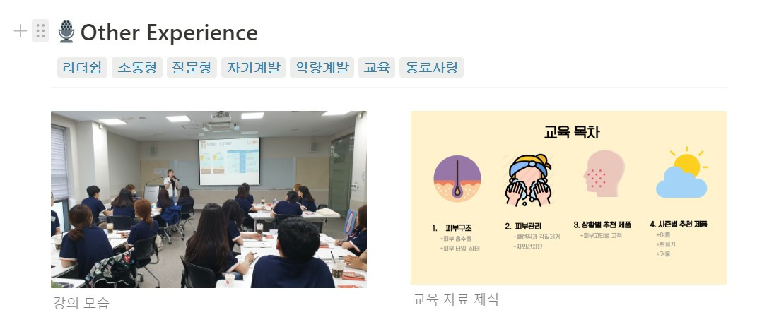 평소 적극적이고 활발한 모습으로 동료 위아래로 소통할 수 있는 기회가 많았기 때문에 회사에서 지원해주는 교육을 다양하게 참석해볼 수 있었다. 그 경험을 토대로 나는 리더십 역량, 스피치 능력에 대해 어느 정도 소질이 있으며 계발 욕구가 있다는 것을 알았다.