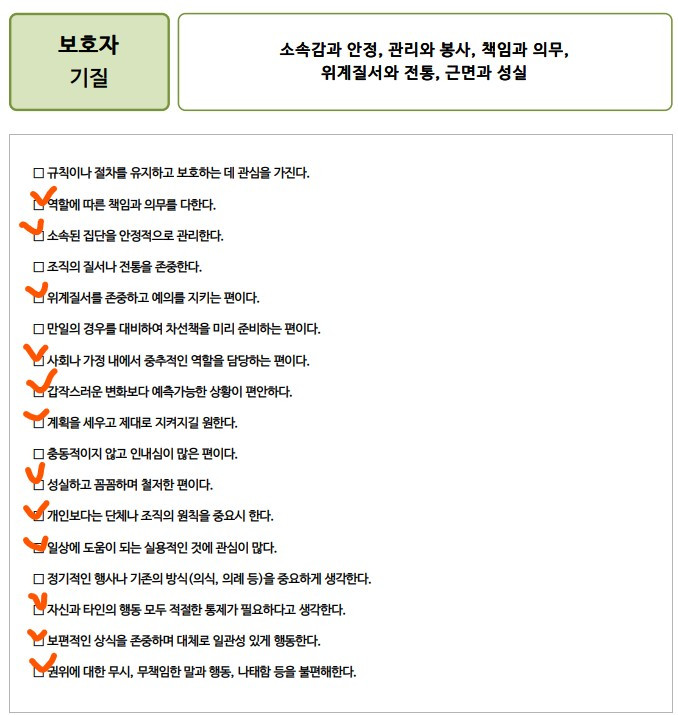 보호자 기질은 무난하게 직장생활을 잘하는 모범생들이다. 질서와 규칙, 조직의 단합, 권위를 중시하기 때문에 예의 있게 사회관계를 유지하며 일을 끝까지 마무리하는 책임감 있는 사람이다.