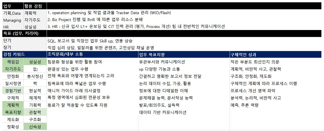 나의 기질, 강점을 기반으로 더 잘할 수 있는 분야는 1) 조직 문화 (소통), 팀 목표를 이끌어내는 전반적인 업무와 동료 코칭 지원 , 2) 목표 지향적인 업무 스타일상 폭넓은 비즈니스 의사소통 확장, 3) 확실한 동기부여 및 계획적 사고를 발전시킬 수 있는 성과 중심 자기 주도 발휘로 주제를 잡았다.