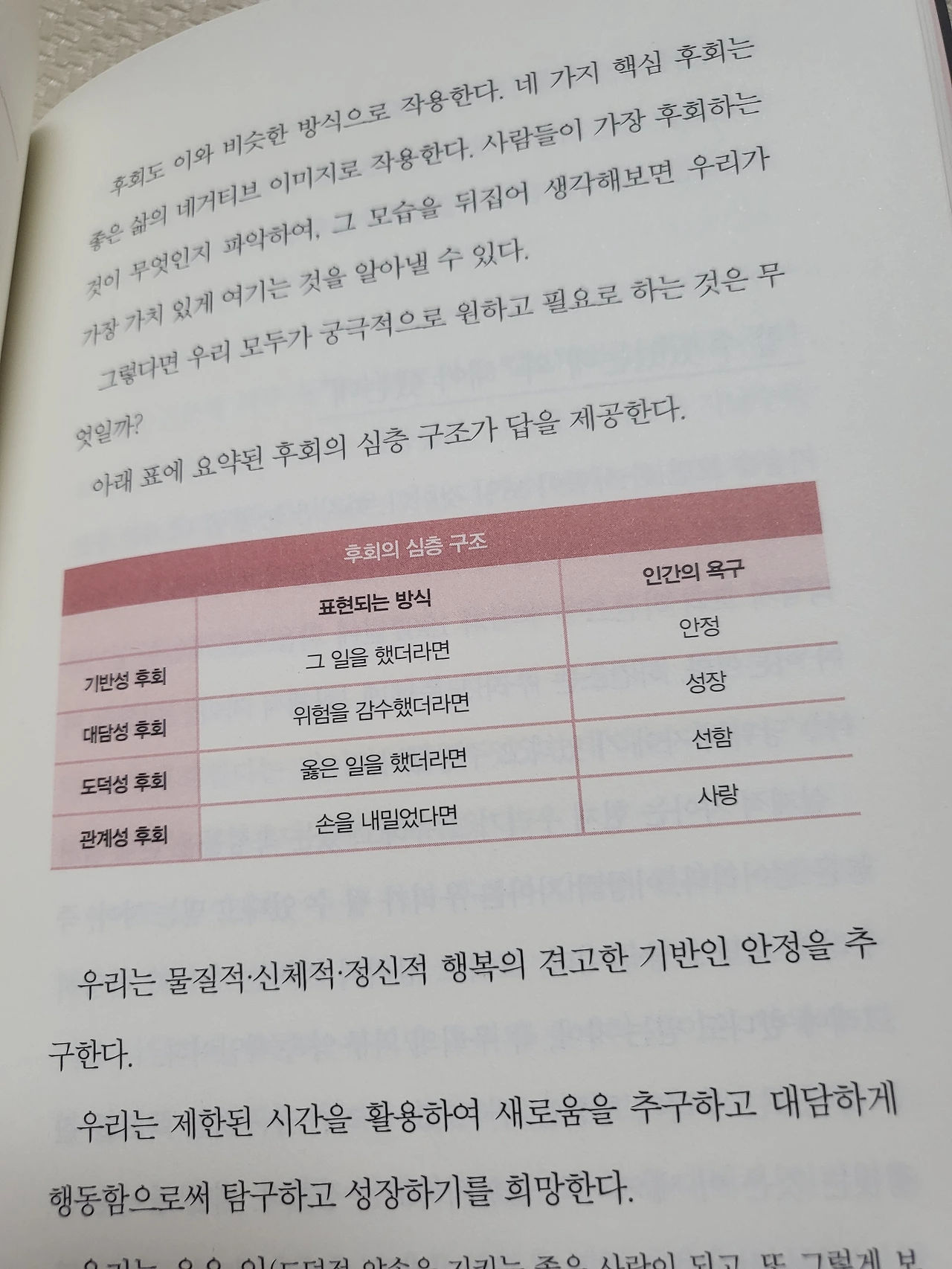 다니엘 핑크는 수만명의 후회 빅데이터를 바탕으로 후회의 심층 구조를 4가지로 분류했다. 후회 구조 사례들을 보며, 나는 하지 않은 선택에 대한 후회보다 선택을 함으로서의 후회를 경험하는 것으로 삶의 방향을 정했다. 그 후회의 경험을 토대로 더 나의 결정을 하는데 밑거름이 될 것이라 확신한다.