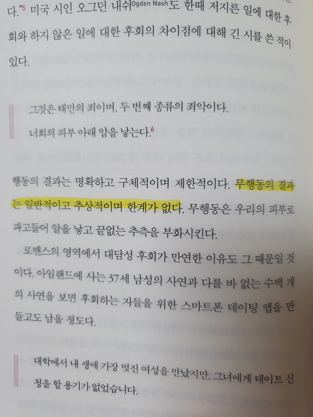 후회는 곧 선택이다. '~할걸', '하지말걸' 나의 행동에 기인한 선택에 따라 벌어진 결과를 후회하기도 하고 상상하기도 하며 더 나은 선택을 하지 못한 것에 대해 돌이켜보는 것이다. 대부분 나의 후회는 '하지말걸'이었다면 이번엔 '할까말까' 고민에 대한 최소한의 후회를 하기 위해 결정적으로 이 책을 구입하게 됐다. (이 선택에 후회는 없다.)