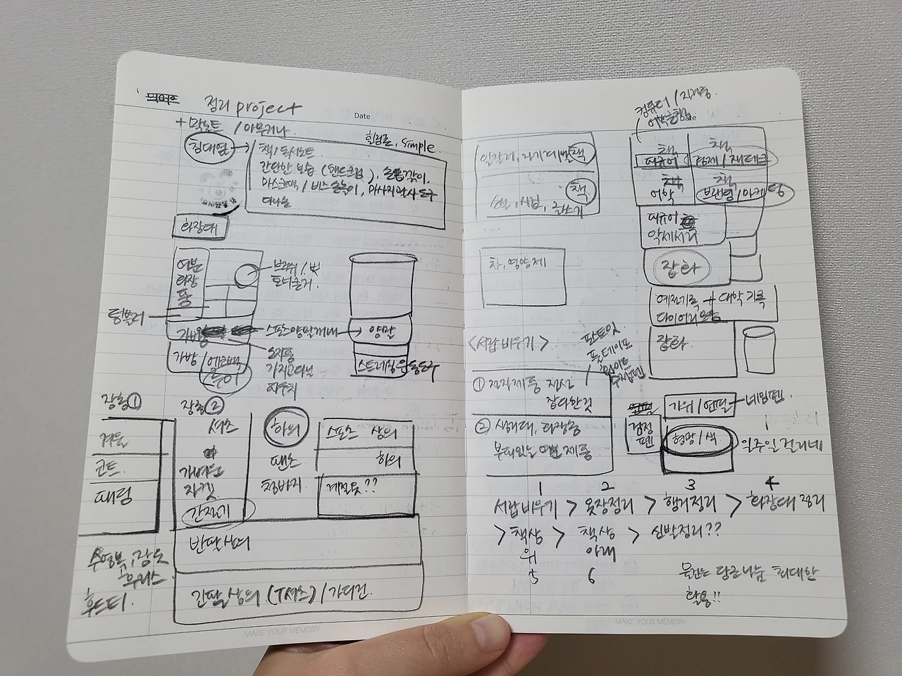 2주간 책상, 화장대, 옷장을 정리하기로 기획했다. 매년 물건 다시 쌓기 수준이었던 방정리였지만 올해는 공간을 카테고리별로 구분해 앞으로도 나의 관심사와 취향을 잘 보이게 하고 싶었다. 무작정 물건을 빼내 쓰레기봉투에 담고 보는 정리가 아니라 물건을 어디에 둘지 가구 공간 별로 나누어 써보니 지금 내 방이 얼마나 엉망인지 알 수 있었다. 지난 몇 년 간 외면하고 들여다보지 않았던 내 마음인 것 같아 얼른 비워내고 싶었다.