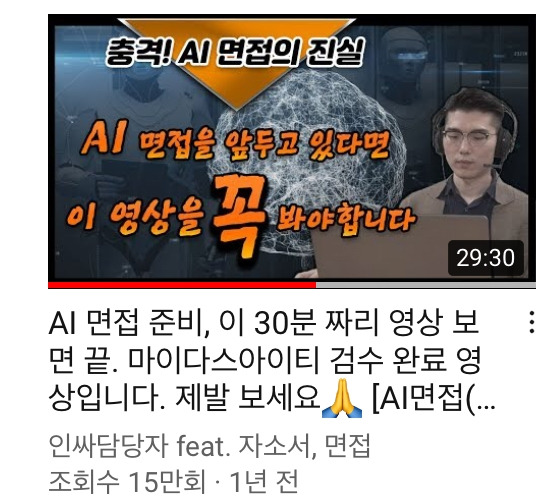 채용절차를 보면서 처음 접했던 단어 ‘AI 인적성 검사’를 보니 덜컥 겁이 나서 지원조차 안 했다. 피하고 피하다가, 뭔지나 알아보자 싶어 유튜브를 검색했다. 이미 수많은 AI 면접 경험자들의 꿀팁과 합격 썰을 볼 수 있었다. 이미 채용 시장에서 AI면접은 이슈였고, 화질 좋은 웹캠과 음질 좋은 스피커를 함께 구매하는 구직자도 꽤 있는 듯했다.