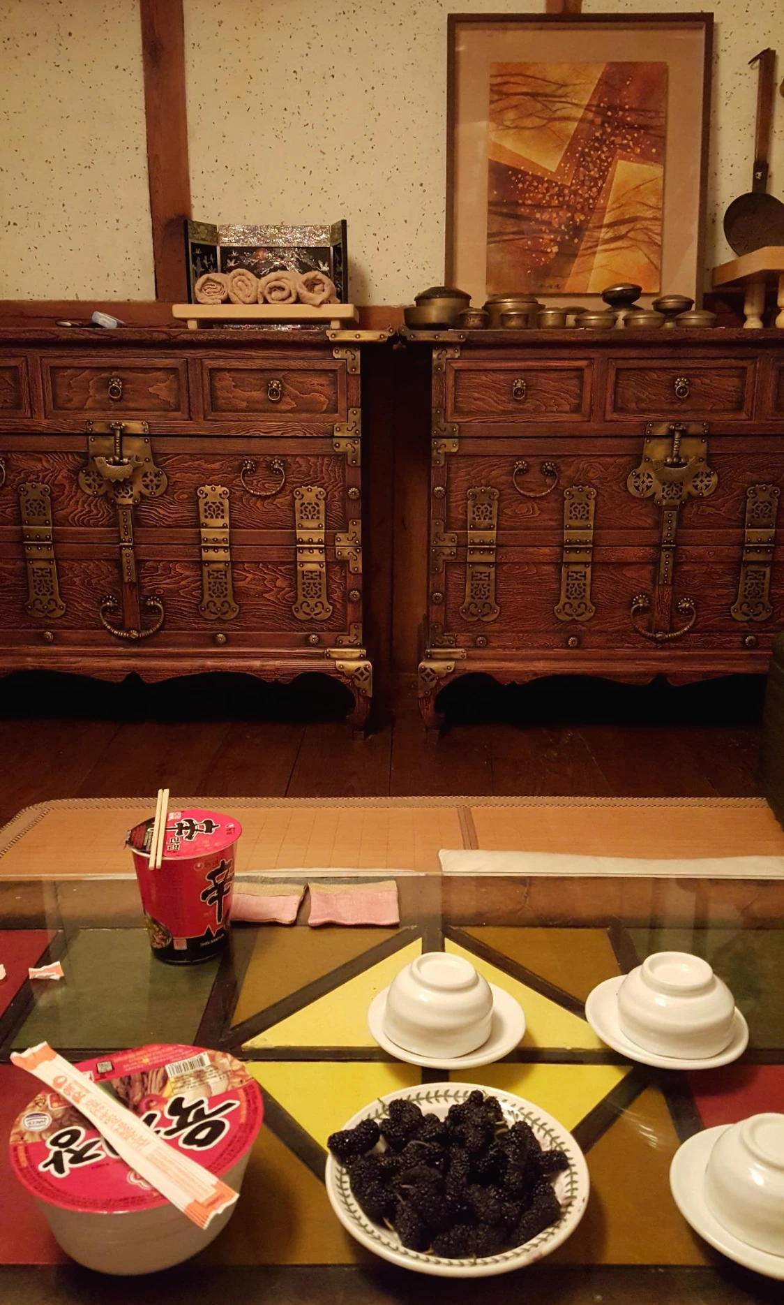 숙소였던 보성 강골마을 사대부집에 한 밤중에 도착했다. 당연 문 연 식당도 없고, 근처 슈퍼도 없을 때 주인아주머니의 부엌에서 귀한 컵라면을 얻었다. 디저트로 싱싱한 오디까지 덤으로!! 한옥 별채 안 고풍스러운 옛 가구들 앞에 앉아서 이 집을 지었던 그 시대에는 상상도 못 했을 간식 컵라면을 먹는다. 뭔가 시대를 교차하는 기분이 드는 이 사진이 재밌게 느껴진다. 다음날 아침 사랑채 앞 평상에서 수박을 먹던 또 다른 투숙객 외국인을 떠올리니 그 역시 시대와 국가까지 넘나드는 재미있는 기억이로구나.
