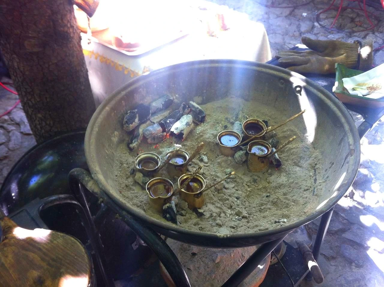 커피콩을 볶고 갈아서 제즈베라는 주전자에 담아 숯불 위에서 끓여낸다. 숯불의 세기나, 커피의 양, 끓이는 시간 등 많은 변수들이 있어서 맛이 조금씩 다르다고 했다. 우리가 마시는 물 같은 아메리카노랑 달리 색부터 진하며 묵직한 맛이 따라온다. 마신 뒤 바닥엔 침잠된 커피 가루를 바라본다. 처음 이스탄불에서 작은 잔에 담겨 온 걸쭉한 터키 커피를 벌컥 마시고 입에 들어온 커피 가루에 1차 놀람, 한약을 마시는 기분에 2차 충격이 있었다. 하지만 이 곳에서 안내해준 방법대로 마시니 커피 맛 또한 터키 여행 중 마신 중 내게 제일 잘 맞았다. 1) 물로 목과 입을 깨끗하게 한다 2) 진한 터키 커피를 마신다. 3) 달콤한 베리 시럽을 홀짝 한다.