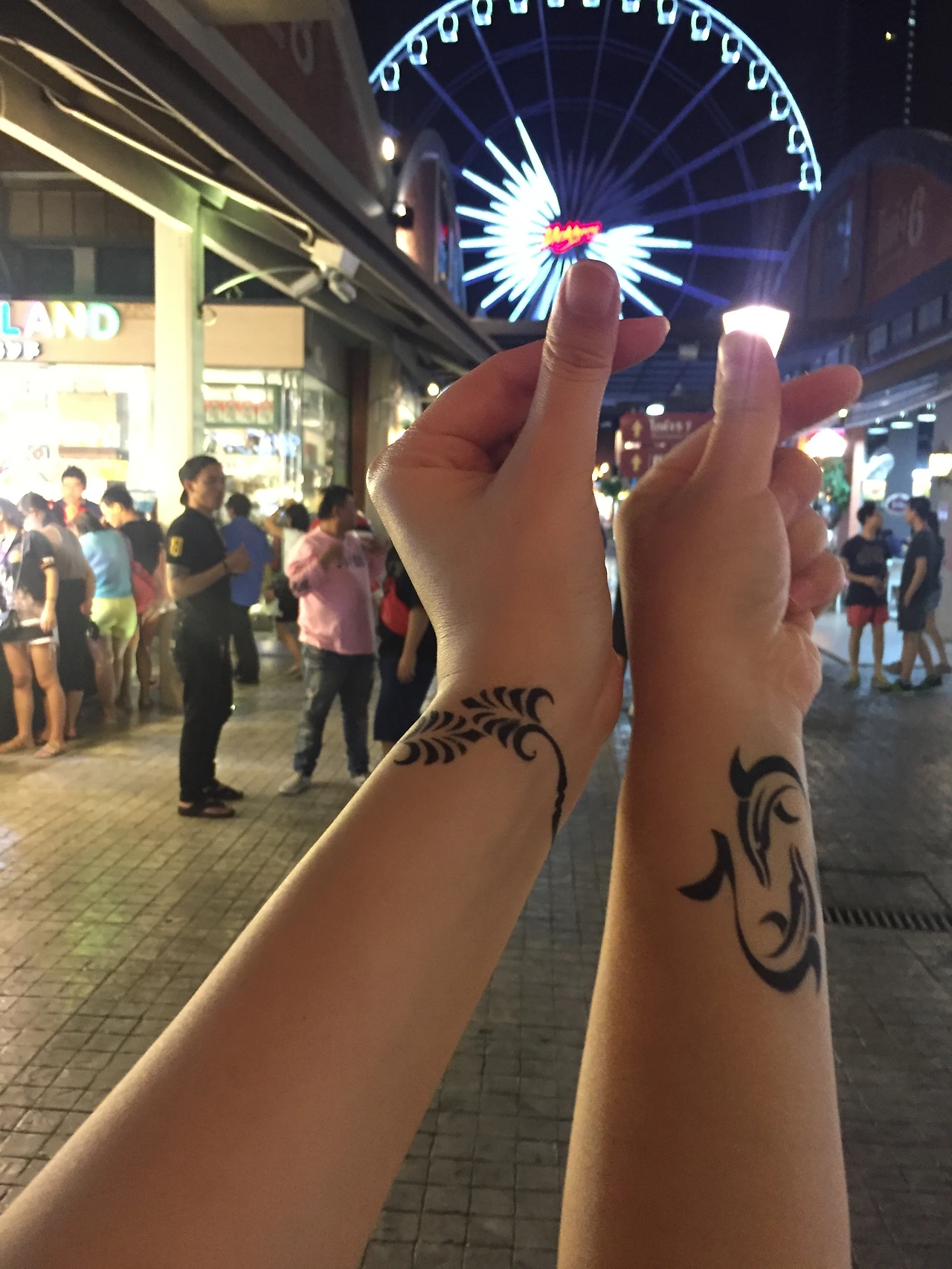 아시아티크의 반응은 두 부류로 나뉜다. 누군가는 지나지게 관광지 같고 물건도 짜뚜짝보다 비싸서 별로라고한다. 또 누군가는 놀이동산 같고 분위기가 좋다고 한다. 난 방콕을 간다면 아시아티크에 가보라고 추천할 것 같다. 일단 시내에서 머물다 보면 강으로 내려오거나 배를 타는 경험이 없는데 아시아티크로 이동하며 잠시나마 강바람을 쐴 수 있다. 강가 노천에 앉아 호가든 로제 생맥주를 마시면 기분이 좋고, 놀이동산 같은 야시장 아시아티크를 구경하는 것도 재밌다. 짜뚜짝 시장에 가면 좋겠지만 주말까지 방콕에 머물지 않는다면 조금 더 비용을 지불하고 물건을 사는 것도 괜찮을듯하다. 그 비용의 차이가 어마어마한 것이 아니기에. 100밧을 내고 팔에 판박이 문신을 하고 호가든을 마신다. 곧 지워질 문신 같은 하룻밤이 반짝 반짝 빛나며 출렁인다.