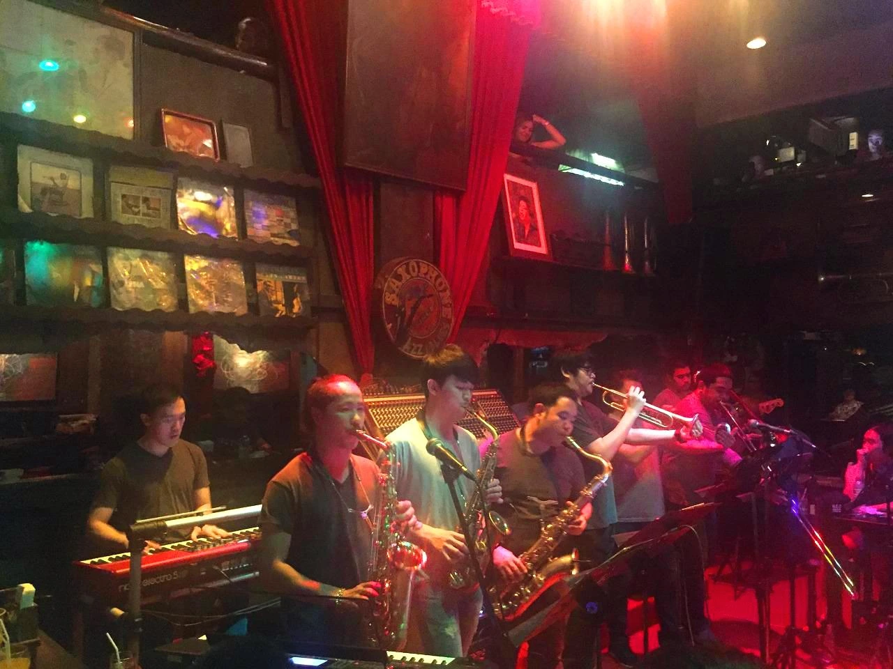 일단 들어가는 입구부터 마음에 쏙 들었다. 내가 기대하고 상상했던 재즈바의 입구랄까? 우리나라처럼 지하로 들어가는 것도 아닌 건물 몇 층에 있는 것도 아닌 건물의 자태와 포스가 문을 열기 전부터 설레었다. 다른 재즈바와 달리 음료도 비싸지 않다. 칵테일 한 잔에 150밧 정도인데 우리나라 물가를 생각하면 한두 잔 정도는 부담 없이 마시며 음악을 즐길 수 있다. 뽬뽬 소리를 직선으로 쏳아대는 금관악기가 이토록 사람의 기분을 업시키는구나. 연주자들이 공연을 즐기고 서로 신나서 연주를 하다 보니 보는 사람들까지 전염돼서 기분이 좋아진다.