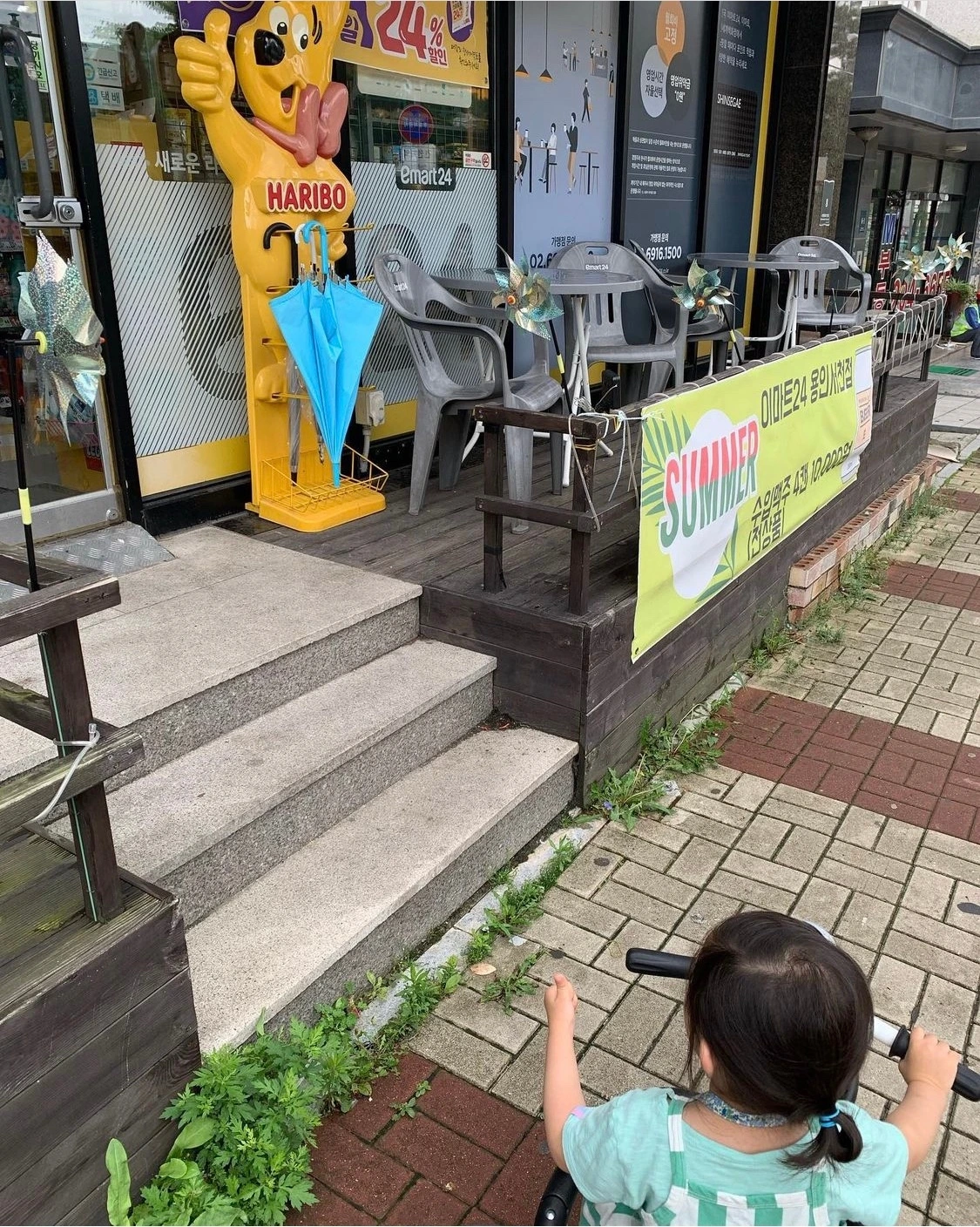 이젠 나까지 궁금해질 지경이었다. 왜 다시 내놓지 않으실까? 무슨 일이 있나? 이렇게 하리보 패널을 걱정하고 궁금해할 일인가 싶지만…나보다 몇 배 더 실망하고 기다리는 딸 때문에 이번에는 내가 편의점을 찾아갔다. 여쭤보니 사장님이 " 아! 그 남편분이 오셨던 집 맞죠? 아이가 그 곰을 좋아해서 기다린다고요" 나는 "네네네 맞아요. 저희 딸이 너무 좋아해서요"라고 격양돼서 호응했다. 그런데 사장님 말씀이 급히 이 가게를 폐업하게 되셨다는 것이 아닌가(헉) 그래서 태풍 후에 다시 내어 놓지 않으셨다고 하셨다. "폐업이요? 아 이제 영업을 안 하시나요?"라고 말하는 내 얼굴에 걱정어린 어두운 빛이 스쳤을까?