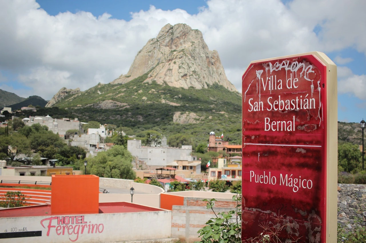 Querétaro의 터미널에서 버스를 타고 혼자 이곳에 왔다. 40분 정도면 올 수 있는 가까운 마을이어서 반나절 동안 시간을 보내다 갈 생각이었다. 버스에서 제대로 못 내릴까 봐 기사 아저씨에게 Peña de Bernal에 꼭 내려달라고 당부하고 눈에 잘 띄도록 맨 앞줄에 앉았다. 그럼에도 아저씨는 여기에 날 내려주는 걸 깜빡하고 5분 정도 더 가다가 갑자기 생각났는지, 한참을 다시 후진해서 내려주었다. 정확하게 딱딱 시간 맞춰 사는 한국이었다면 불가능했을 일. 중남미 여행에선 이런 일이 자주 일어난다. 이곳에선 타임 테이블보다 사람을 더 믿어야 한다. 버스에서 내리자 Peña de Bernal이라는 돌산을 끼고 있는 마을, Villa de San Sebastián의 붉은 표지판이 마을의 수문장처럼 묵묵히 서 있었다.