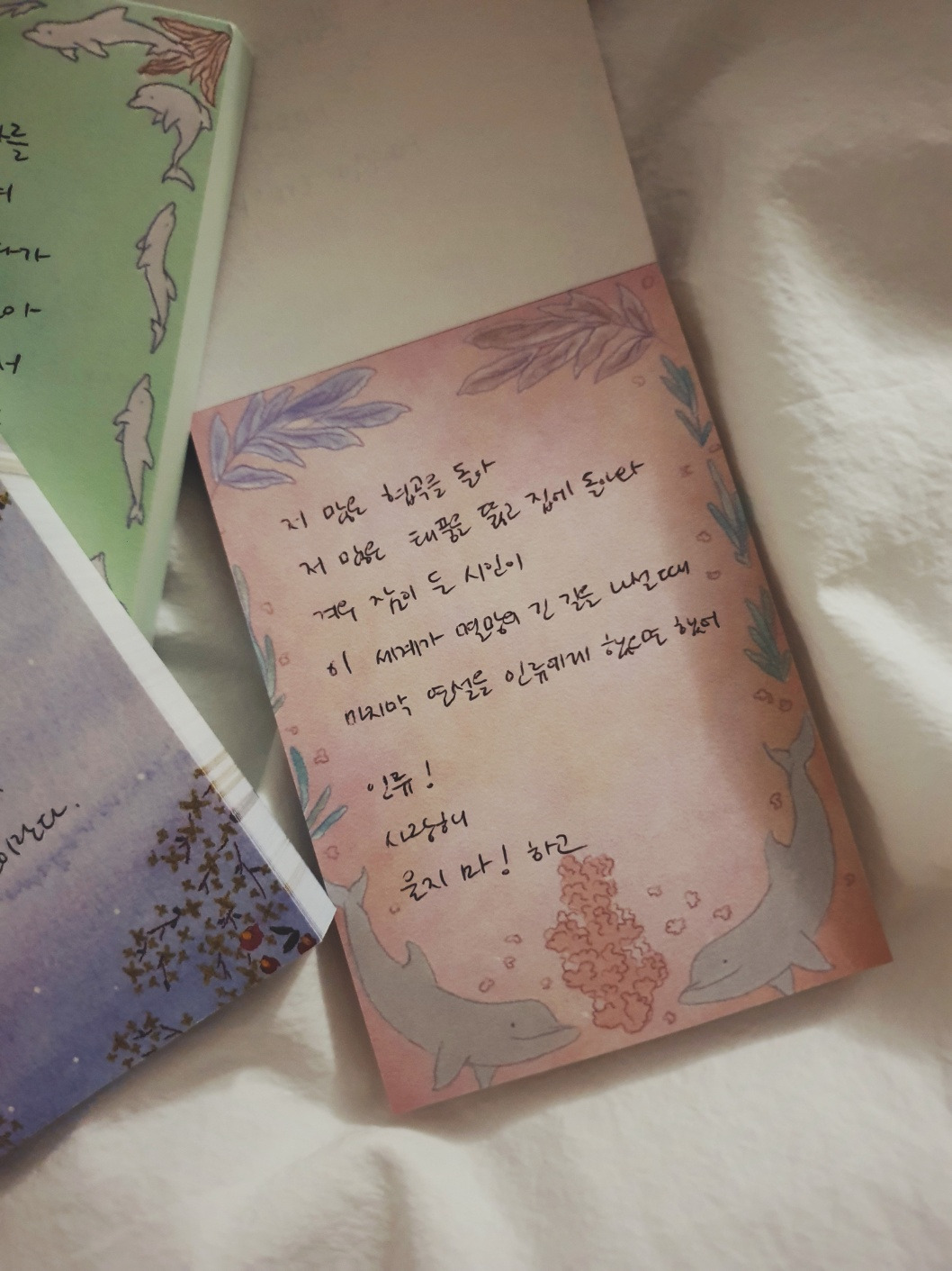 문장 하나에 목덜미를 부여잡고 펑펑 울다 잔 날이 있었다. 세상에 믿을 사람 하나 없다고, 인류애가 바닥났다고 말하고 다닌 나에게, 그 말을 가만히 들어준 무수한 친구들에게, 우리 모두에게 필요한 것은 무엇이었을까. 인류! 사랑해, 울지 마! 살아가는 일이 너무 어려워서 목놓아 울던 밤에 너도 나도 아닌 누군가가 우리를 대신해서 외쳐주는 문장이 있었다. 심장이 멈춰버릴것 같았다. 빨간 불 앞에 서서 한숨짓는 나에게 다가온 '힘내'라는 문장 같았다.