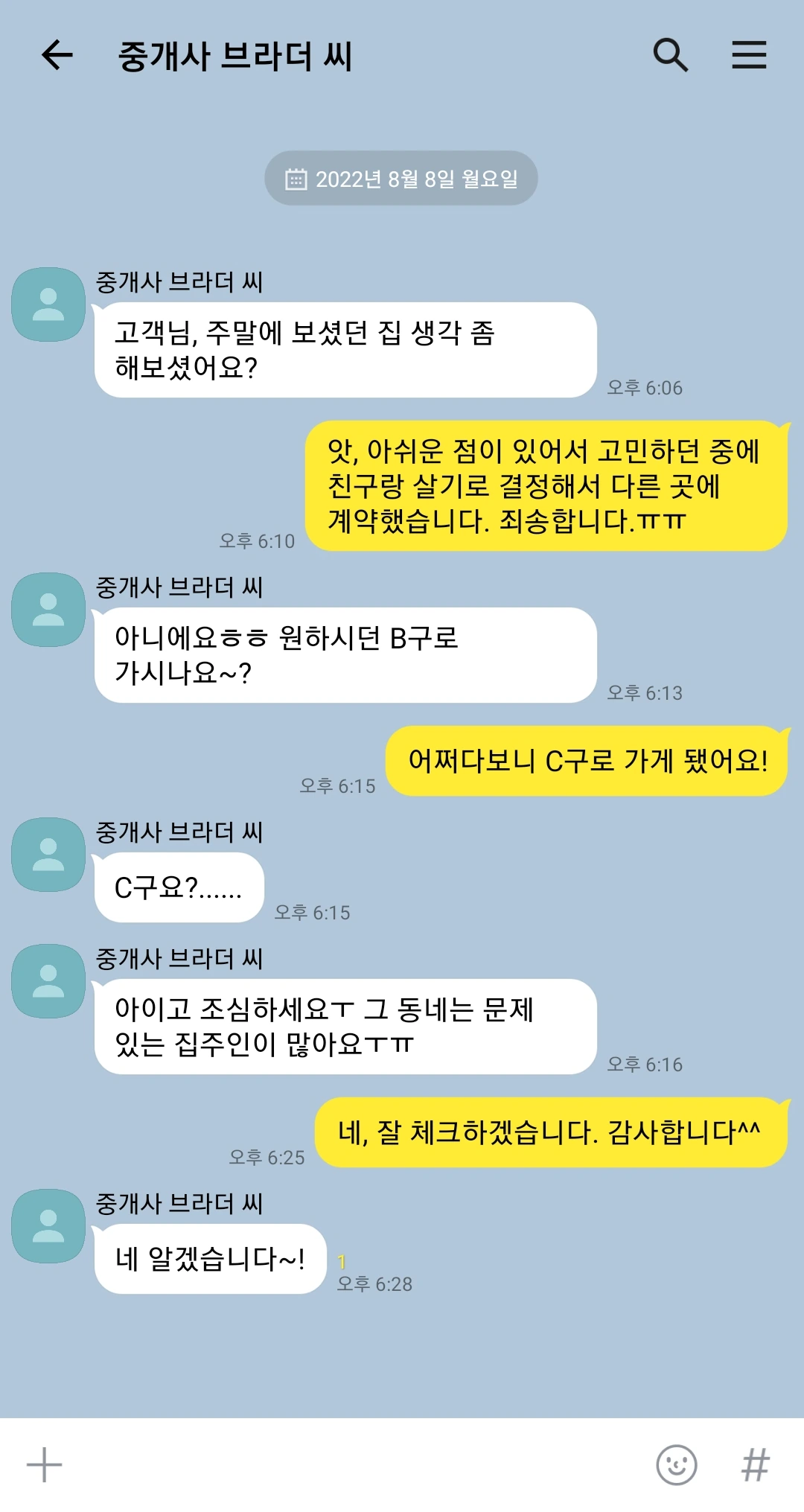 여기서 먼저 중개사 브라더 씨를 등장한다. 그는 이 사건과 관계없이 당시 내가 살고 있던 집을 찾아준 중개사로, 그와도 같이 다음 이사할 집을 둘러본 바 있다. 하지만 나는 소고기를 사준 전세사기꾼 프랭크와 계약을 하고 말았다. 브라더 씨와의 마지막 연락이 사건의 복선이었을 줄이야.