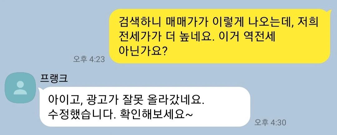 확인해 보니 매매가를 올려서 전세가랑 똑같이 수정해 놓았다. 진짜 호구로 아는구나. 그래, 호구가 맞긴 하지.