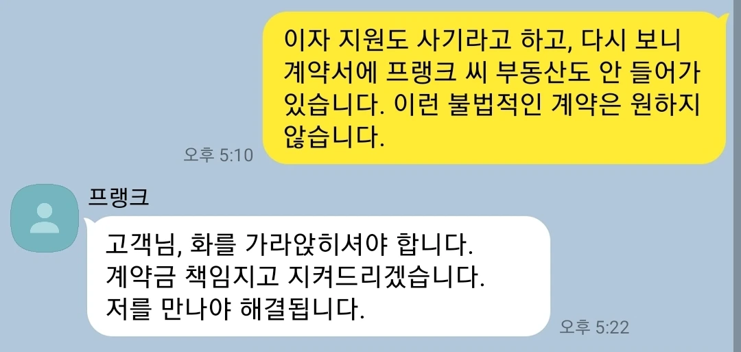 부동산 전문가도, 법률 전문가도, 모두 계약금을 돌려받을 수 없을 거라고 했다. 프랭크라 야심차게 내세웠던 '대출 이자 지원' 역시 합법도 불법도 아닌 사각지대에 있어서 신고하기 애매하다고 했다.