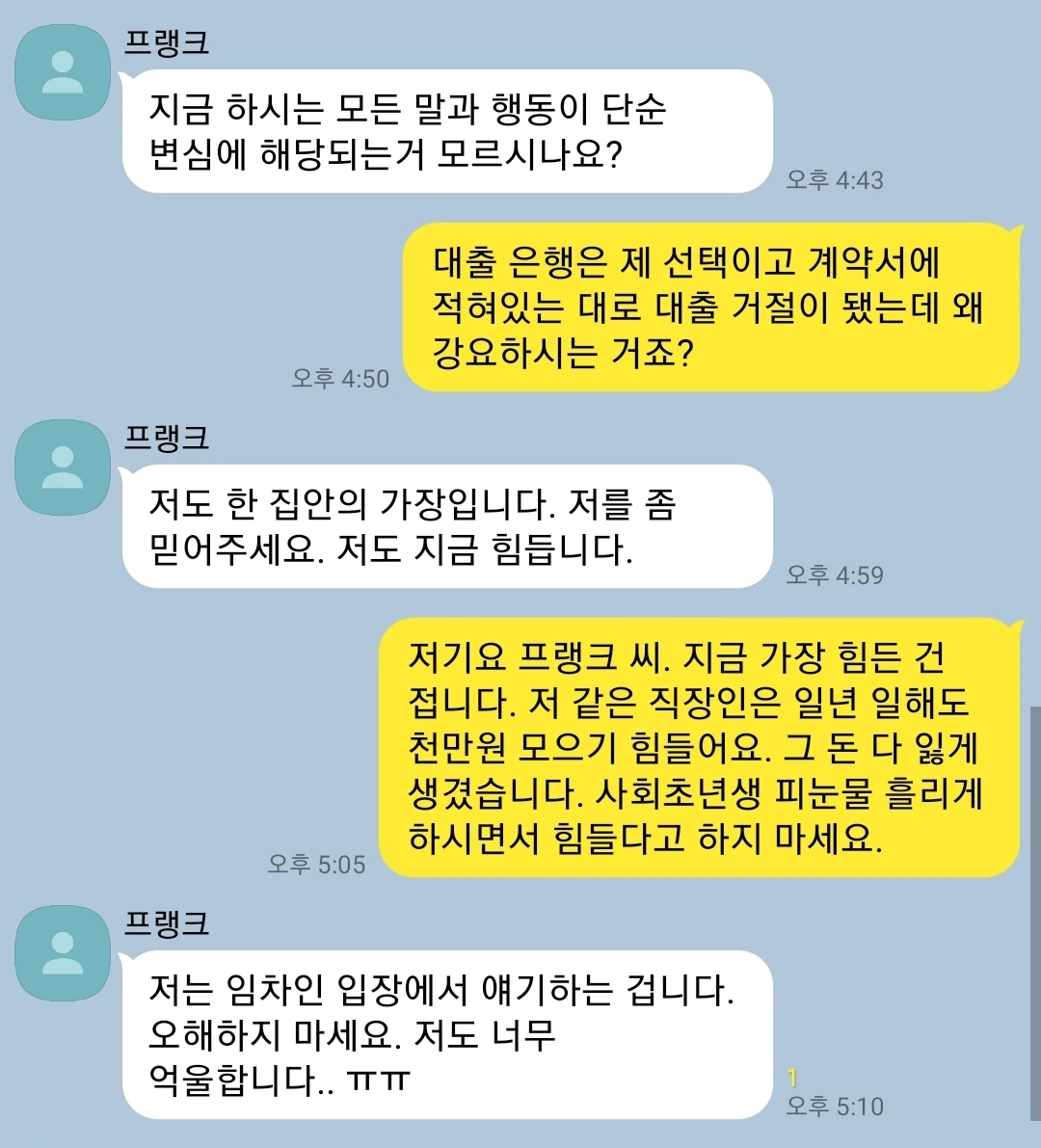 수 억의 대출을 진행해 줄 대출상담사가 명함 한 장 안 주고 발뺌하는데, 그게 더 이상한 거 아닌가? 그러나 전세사기를 당해도 신고할 시스템이 없었고, 특약으로 소송에 가도 (한 공인중개사의 자문에 의하면) 질 확률이 90% 이상이라고 했다. 깡통 전세를 초기 단계에 알게 된다고 해도 법은 사기꾼에게 압도적으로 유리했다. 심지어 프랭크는 나이, 가정을 들먹이면서 감정에 호소하기까지 했다.