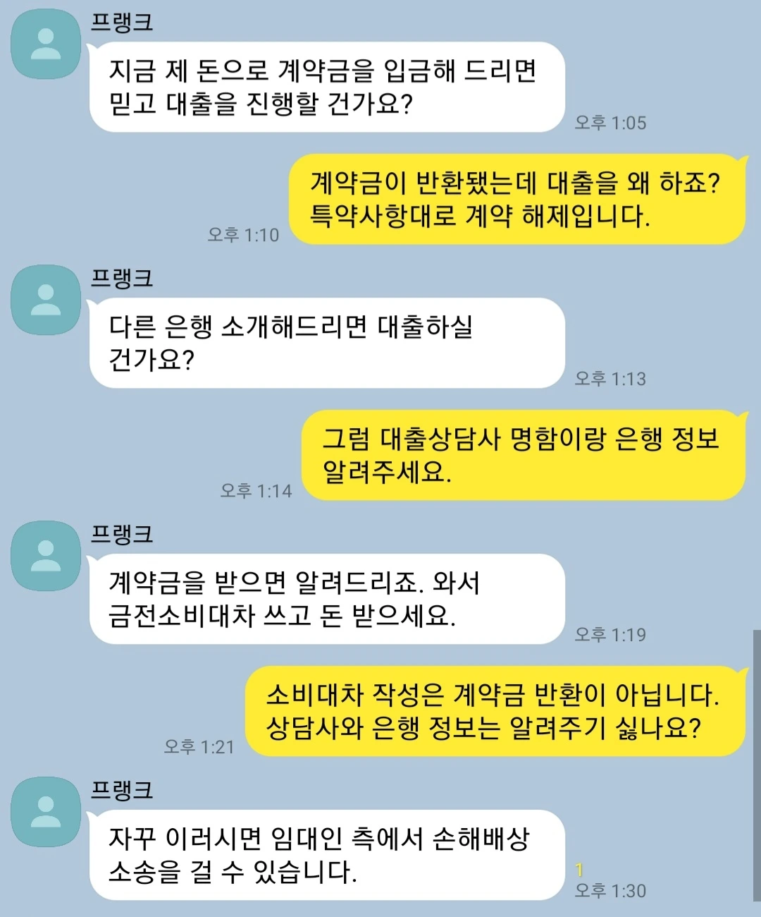 이상한 점은 한두 개가 아니었다. 대출 은행에 대한 정보는 비밀이라도 되는 양 끝까지 말하지 않았고, 계약금을 받아야만 대출 은행을 알려주겠다는 말도 안 되는 논리를 펼쳤다. 금전소비대차는 돈을 빌려주고 갚겠다는 약속에 대한 서류로 계약금 반환과 전혀 상관없는 얘기였으며, 쓰는 순간 내가 프랭크에게 돈을 빌리는 구조로 역이용되는 것이었다. 이 단계에서는 변호사님의 조언에 따라 "특약에 따라 계약금을 반환하고 계약금 반환 확인서를 작성하자"고 말했지만, 프랭크는 끈질기게 나를 대출 미협조로 몰아갔다. 게다가 '갑질' 모략에 이어 이번엔 '손해배상 소송'까지 하겠다고 한다.