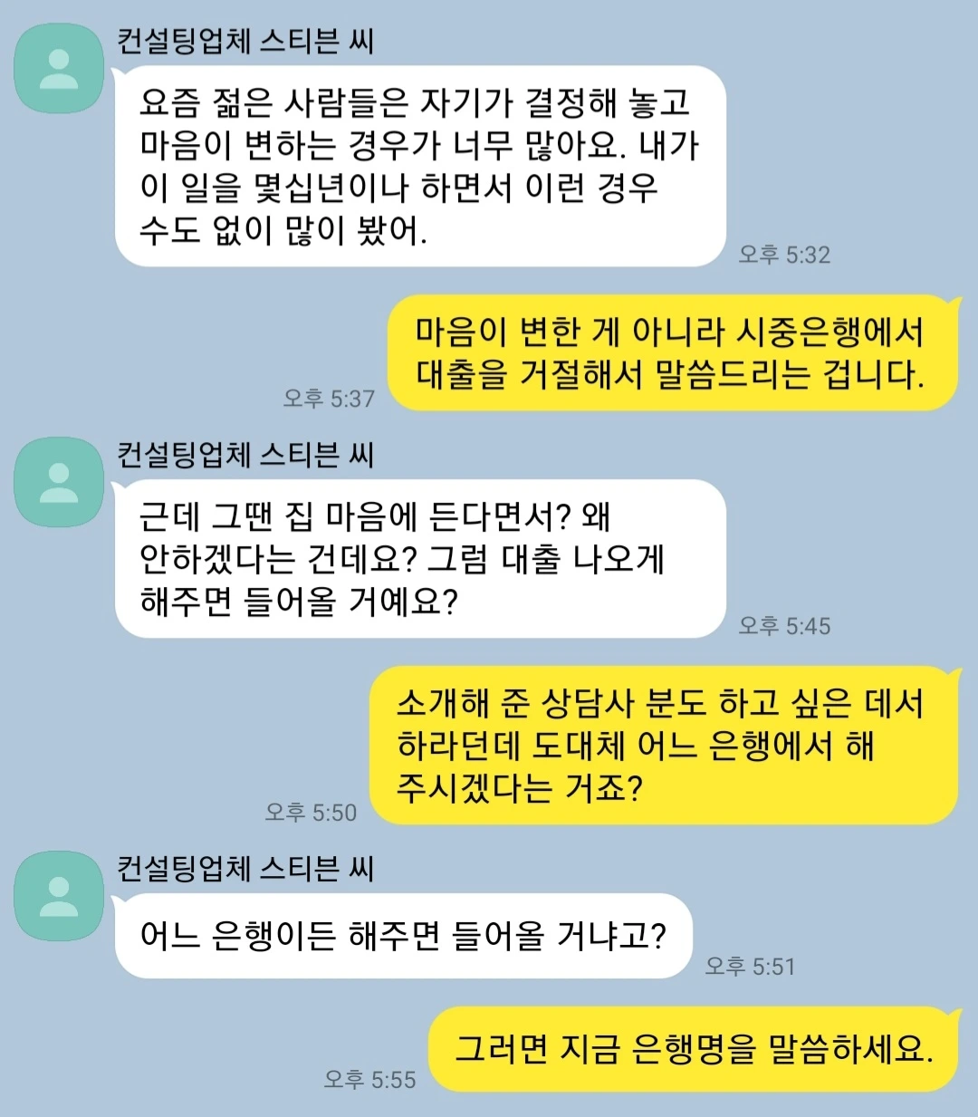 그는 공방전 내내 '요즘 젊은 사람들은 예의가 없다'며 논점을 흐리고, '이랬다 저랬다 한다'며 단순 변심으로 몰아갔다. 그러거나 말거나 나는 프랭크와 스티븐을 거쳐 건축주에게 직접 연락했다. 건축주는 응답이 없었지만 반복해서 의사를 전달하고 대출 거절 증거를 전송했다.