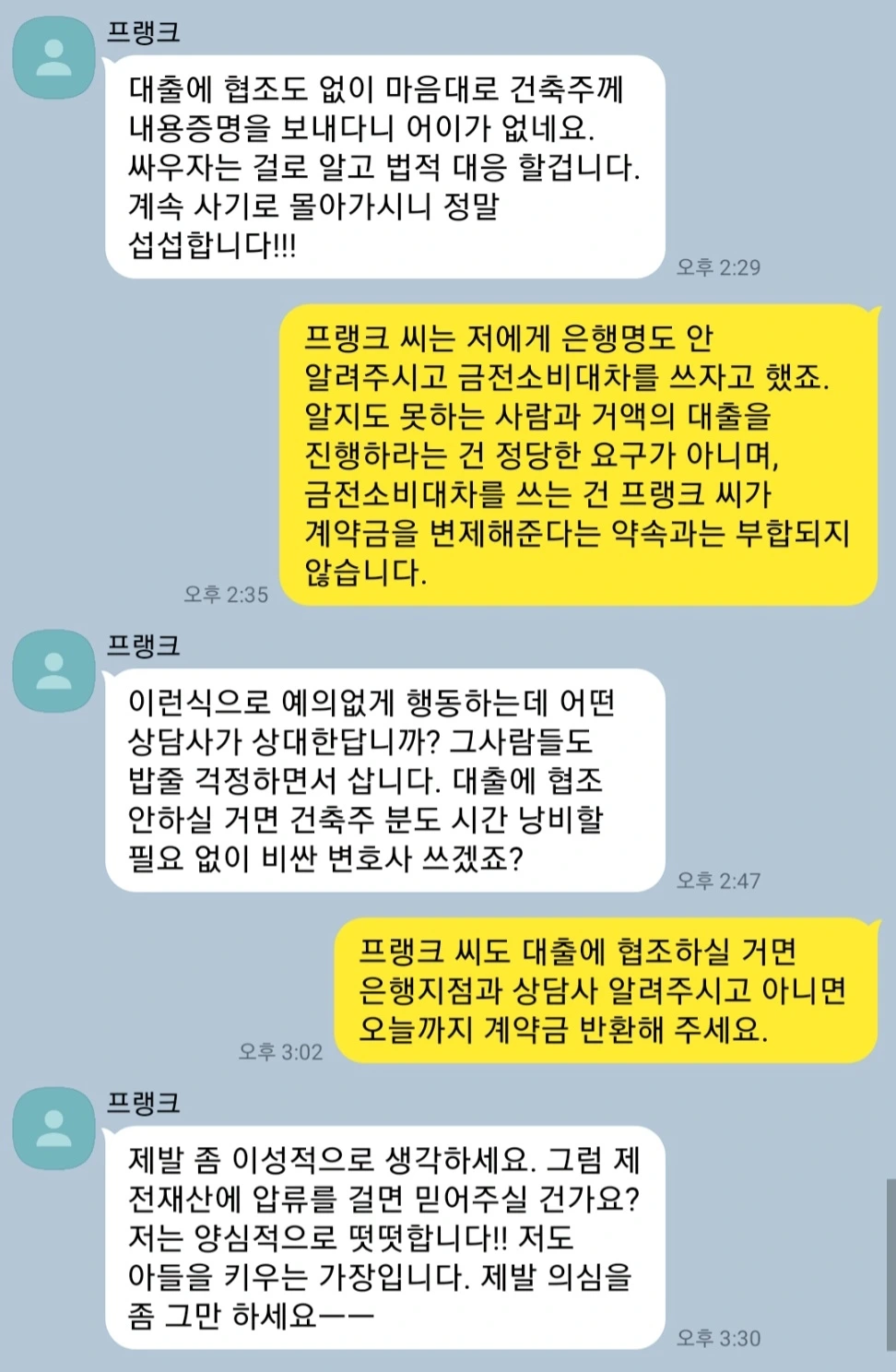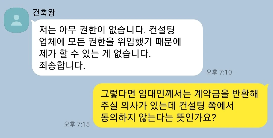 계약서상 계약은 분명히 건축주와 체결했으며 계약금도 건축주의 통장으로 들어갔기에 자신의 책임이 맞는데도, 자신은 컨설팅 업체의 허락이 있어야만 모든 걸 할 수 있는것처럼 말하고 있었다. 그러나 프랭크는 그동안 자신은 임차인의 입장을 대변하고 있다며 줄곧 건축주 핑계를 대 왔다. 조직화된 사기꾼들이, 불리한 것을 서로서로 떠넘기고 있었다.