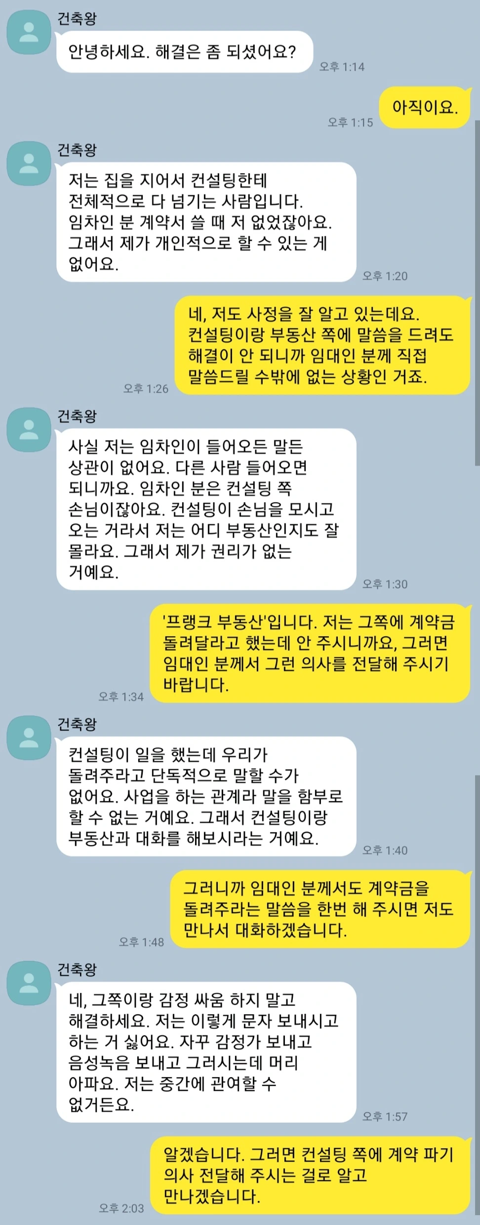 나: 저한테는 회장님이 아니라 그냥 임대인입니다. 임대인의 대리인이 있다고 해도 어쨌든 임대인 분 통장으로 돈을 보내드렸고요. 프랭크 씨가 아무 요청도 안 들어주시고 계속 비협조적인 취급 하시니까