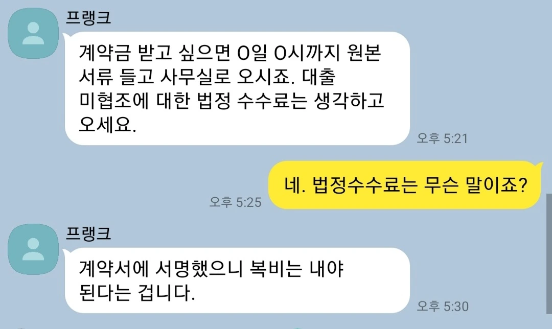 나: 싸우러 온 거 아니고요, 대출 거절 됐으니 임대인 분께서 계약금 돌려주신다고 해서 온 겁니다.