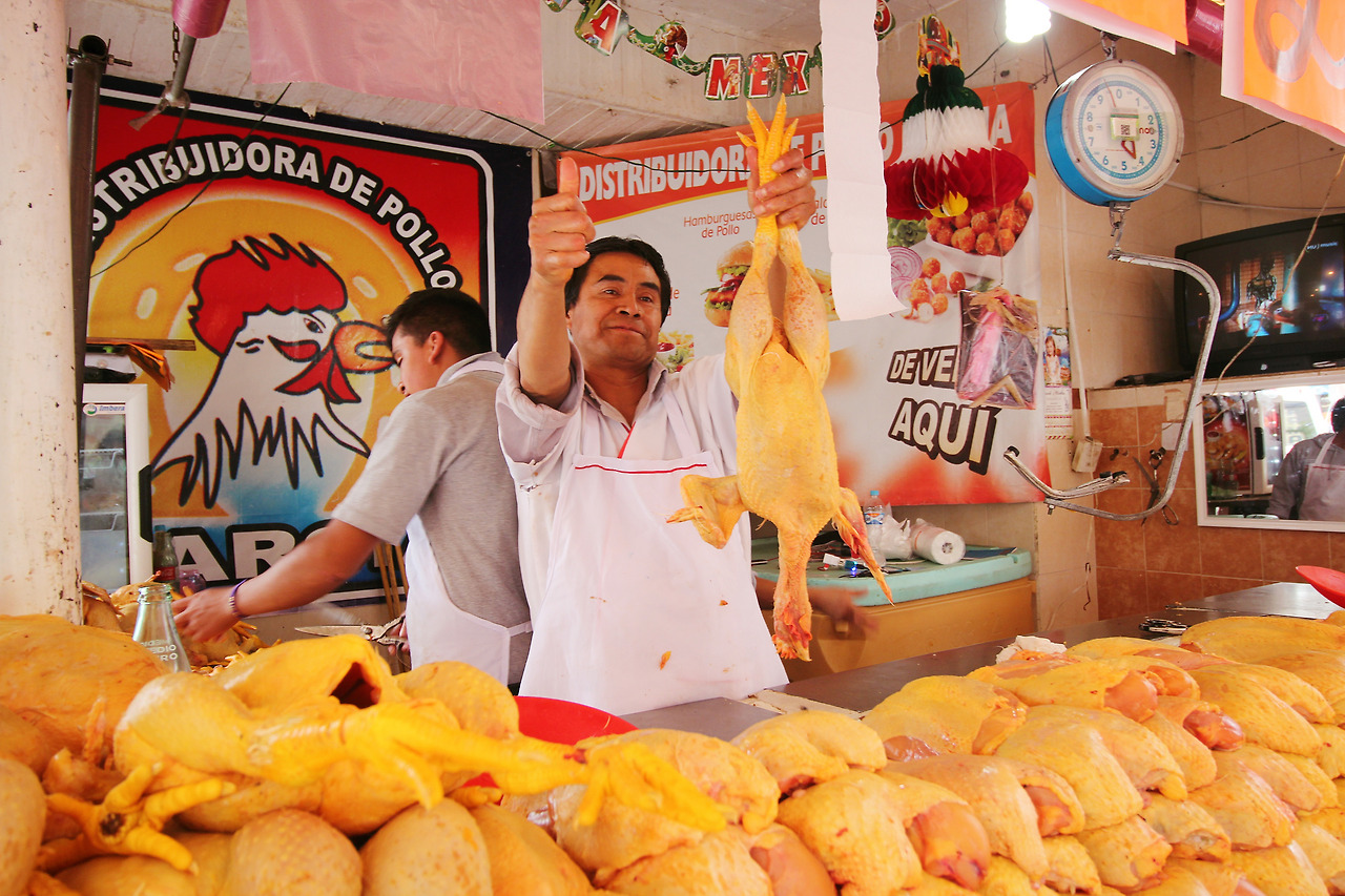 시장에 도착하자 만난 생닭을 파는 가게. 멕시카나 치킨들(?)의 엄청난 크기에 감탄하고 있는데, 카메라를 보고 선뜻 포즈를 취해주는 재밌는 가게 아저씨. 낯선 외국인에게도 유쾌하고 친절하다.