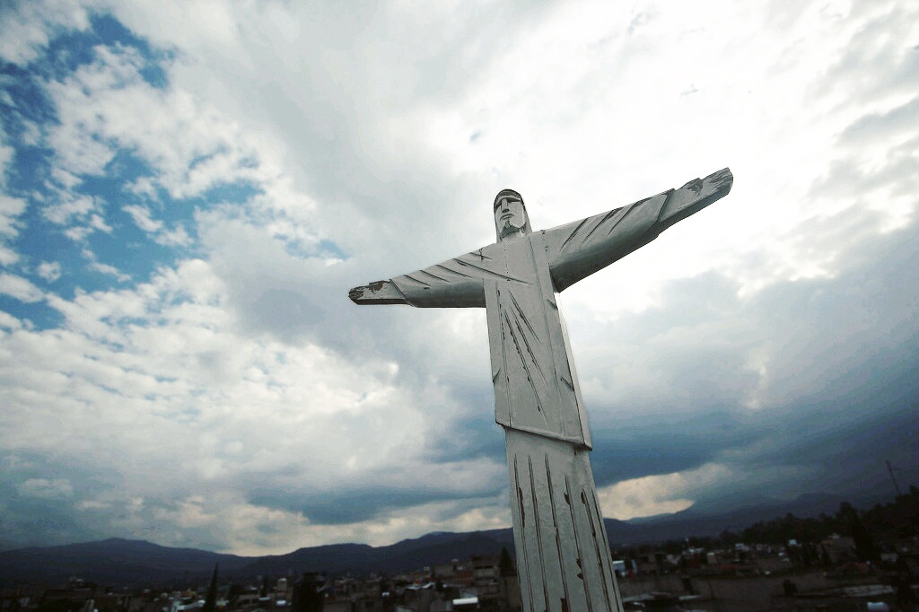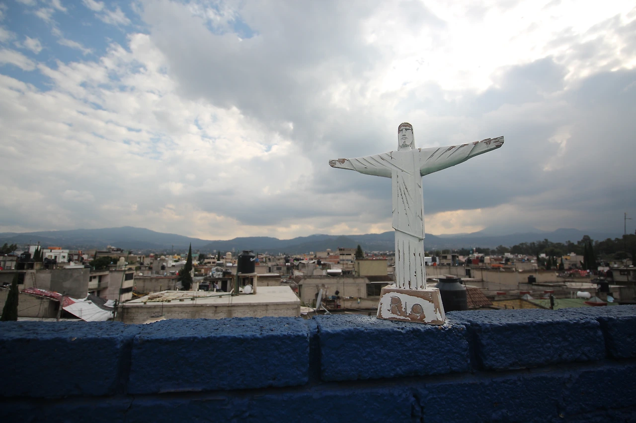 파란 담벼락의 테라스에서는 소치밀코가 훤히 내려다 보였다. 온 세상을 품을 듯 두 팔을 벌린 이 예수 사진 역시, 미겔이 몹시 만족해했다.(사실은 예수상도, 비행기도 아주 작은 피규어이다.)