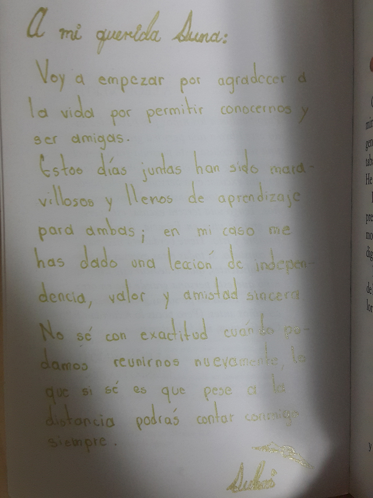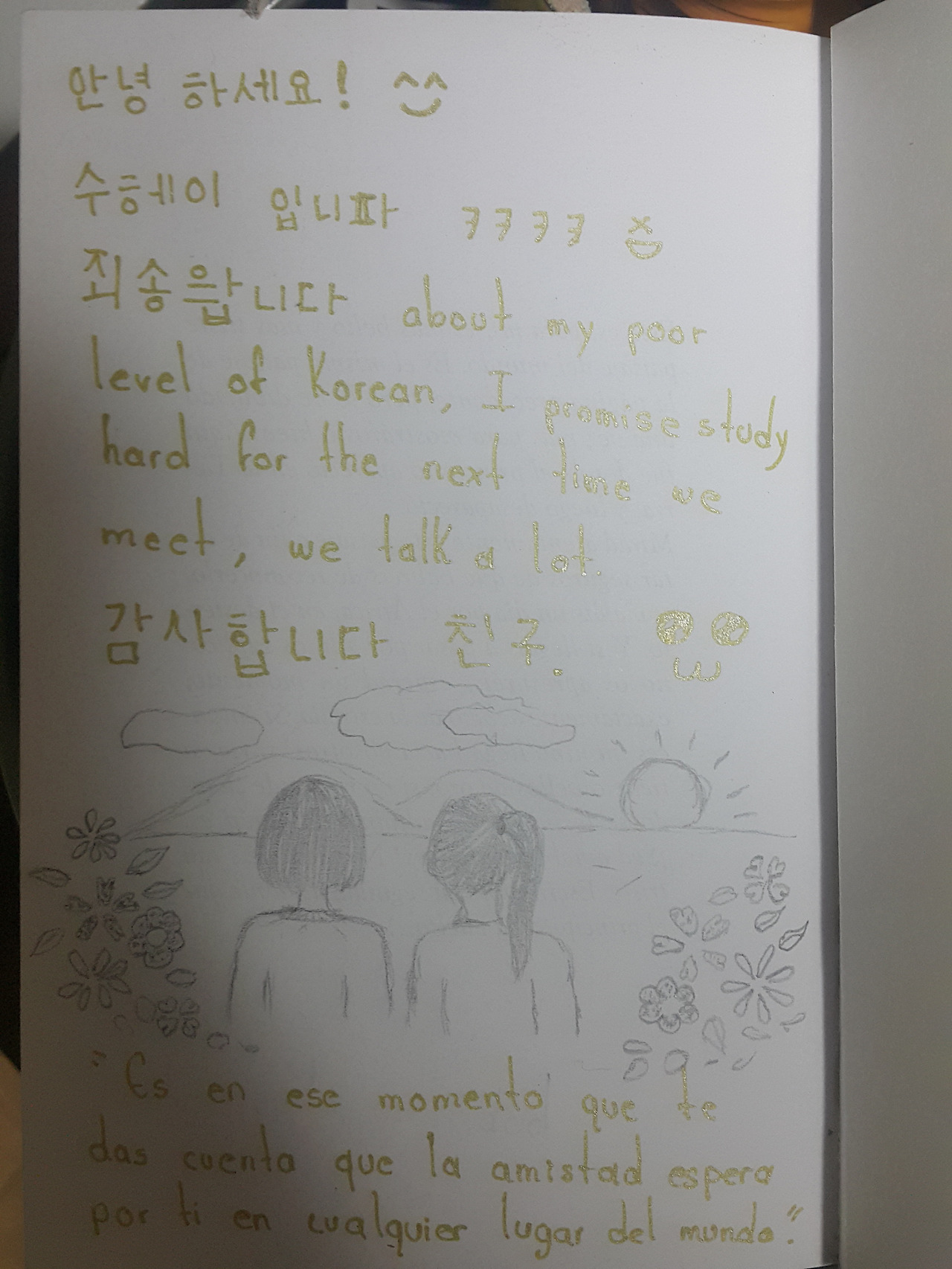 수는 우리가 까페에 들어가서 편지 교환을 하기 전에 미리 깜짝 선물을 준비해 와서 나에게 감동을 안겨주었다. 그녀가 선물해 준 것은 '어린 왕자' 스페인어 버전 책이었다. 내가 소설책을 읽으며 공부를 해 왔다는 것을 아는 수의 센스 있는 선물이었다. 나도 그녀에게 스페인어와 한국어를 섞어서 편지를 써 주었다. 언젠가 꼭 한국에 놀러 오라고, 할머니가 되어서 와도 기억하겠다는 내용이었는데, 한국어 부분은 수가 스스로 더 공부해서 해석해보고 싶다고 해서 알려주지 않았다. 그녀의 독학 한국어를 응원한다!