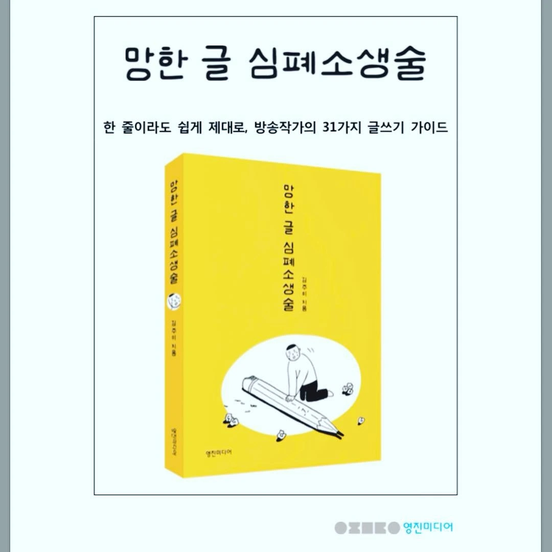 이 책이 만난 행운 마지막은 제목과 표지 디자인입니다. 대다수의 책이 그렇겠지만, 원래는 책 제목이 달랐습니다. 그러다 제가 쓴 방송작가로서의 경험담이 모두 실패담이란 데에 착안해 출판사와 회의에 회의를 거듭하여 <망한 글 심폐소생술>이란 제목을 정했습니다. 처음엔 저도, 주위에서도 우려가 많았습니다. 마지막까지 더 평이하고 부드러운 제목을 바꿨으면 좋겠다고 조언한 지인들도 있었습니다. 그러나 우리가 함께 선택한 제목을 믿고 그냥 가기로 했습니다.