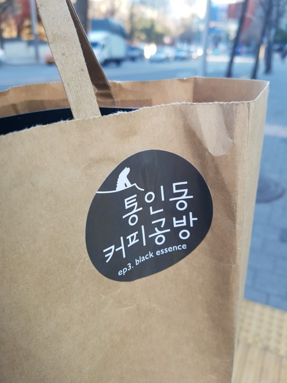 원두를 사면서 받은 종이팩에 붙은 커피공방의 원형 로고 스티커는 이곳 지역이 어디에 있는 것인지를 알게 해 준다. 디자이너나 혹은 대표가 이 로고 스티커를 만들면서 고민하지 않았을까 싶다. 커피를 담을지, 지역을 담을지 말이다. 처음의 시작은 어떠했는지 모르지만 커피공방은 통인동이 어디에 있는 동네인지 미루어 짐작하게 하고 사람들로 하여금 궁금하게 만드는 로고를 선택했다.