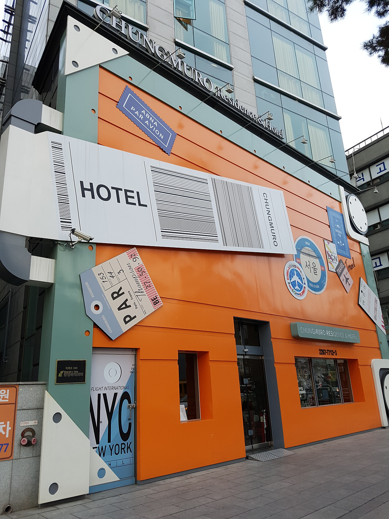 서울 퇴계로 중구청 사거리 가는 길에 만난 호텔. 충무로 레지던스&호텔. 컬러풀한 호텔 외관이 눈길을 끈다. 감성 여행을 자극하는 호텔 외관의 디자인이 이채롭다. 비행기 탑승 시 패키지 태크 레이블과 공항에서 만나는 다양한 사인과 아이콘들을 비롯 패스포트에 찍히는 도장의 이미지를 가져와 입구를 장식했다. 전체적으로는 손잡이와 바퀴를 가져다 누워있는 혹은 끌려가는(?) 여행가방을 표현했다. 여행가방이 멈춘 곳, 그곳이 바로 호텔.