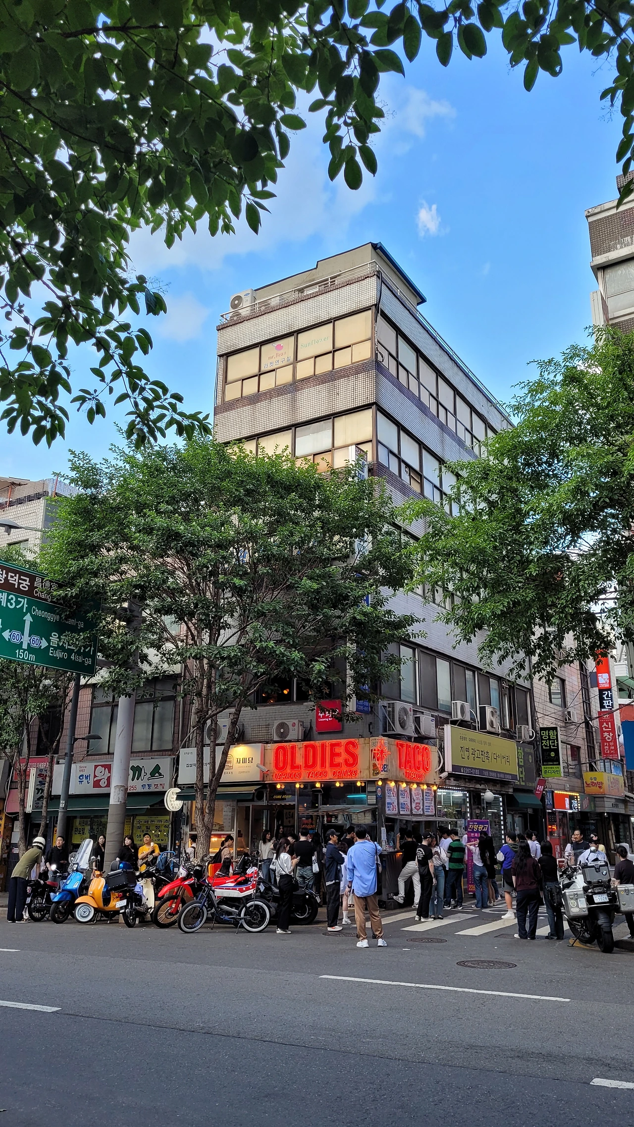 출력물을 기다리다 본 건너편 풍경. 알고 보니 요즘 핫하다는 타코 음식점이다. 길 가던 사람들이 멈춰서 사진을 찍는다. 가게 간판은 현지에서 갖고 온 느낌이다. 3시 간 정도 지나서 다시 찾아갔지만 줄은 크게 변함이 없다.