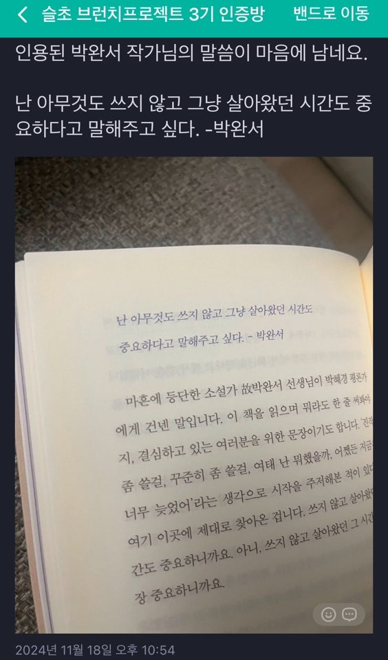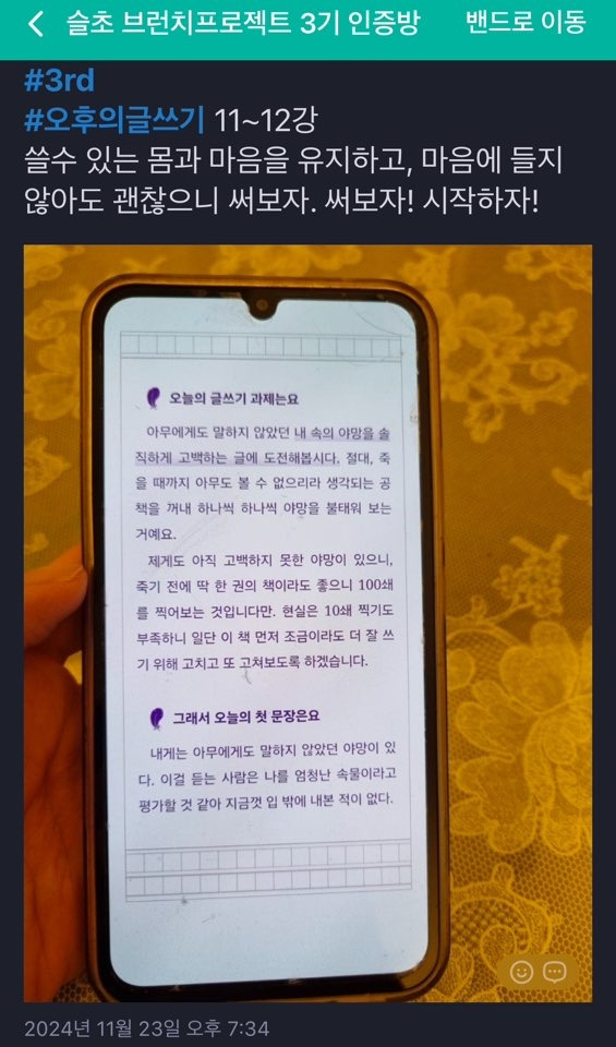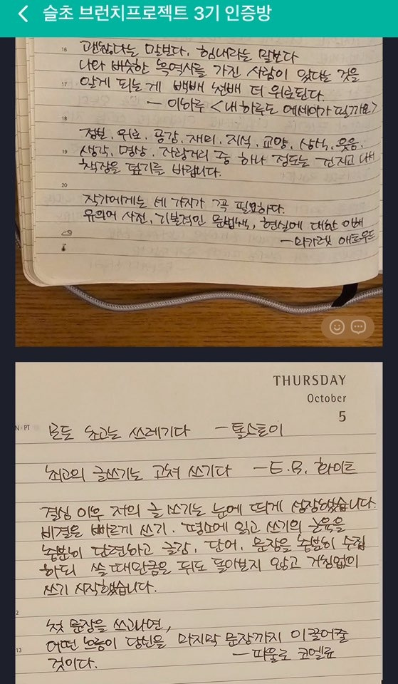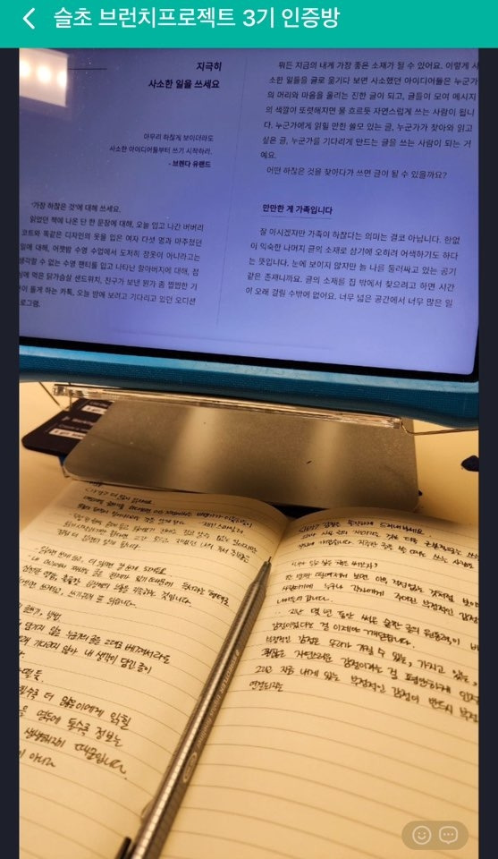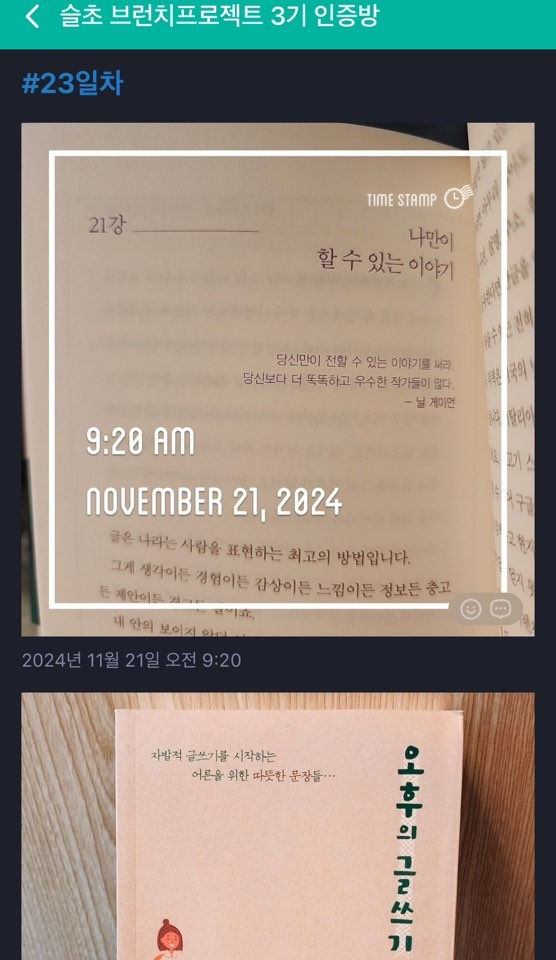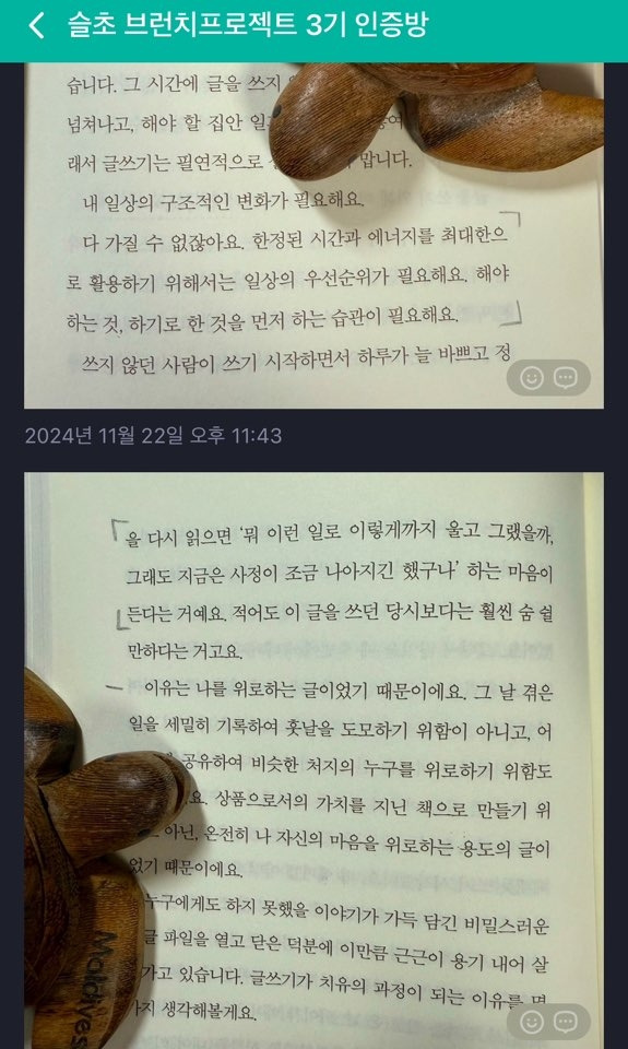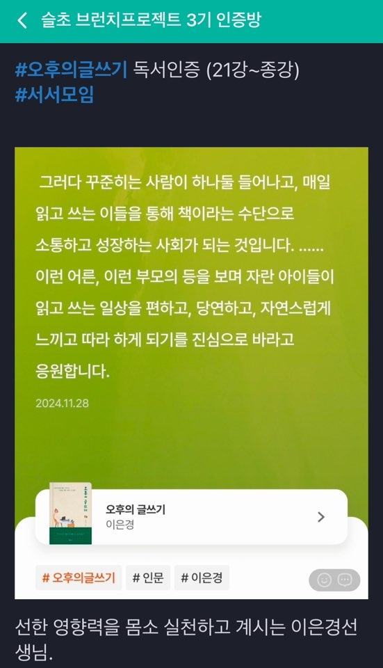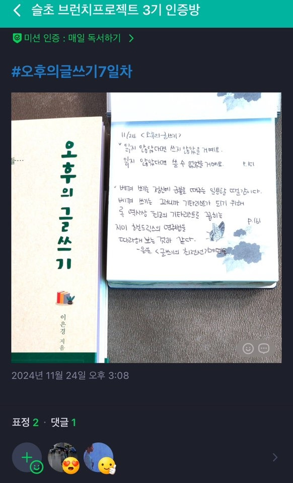 서서모임은 이은경 작가님의 '오후의 글쓰기'라는 책을 2주 동안 함께 읽으며, 매일 맘에 드는 문장을 골라 필사하고 온라인으로 감상을 나눴다. 11월 18일부터 함께 읽기 시작했는데, 나는 마침 선물 받은 그 책이 이틀 후에 도착하면서 조금 늦게 합류했다. 뒤늦게 따라가는데, 이미 책을 10번 이상 읽는 느낌이다. 작가님들이 올려주시는 필사 문구와 솔직 담백한 단상만으로도 충분히 책이 내 몸 구석구석에 채워져 있었다.