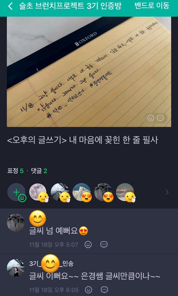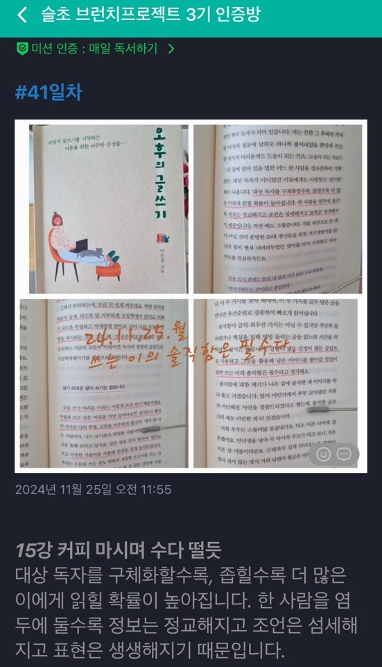 "이런 바람은 지역 모임에서 해보는 게 좋을 것 같아요. '오후의 글쓰기' 책도 다 읽어가는데, 시간 되시는 분들 번개로 모여 다음 책도 고르고 커피도 마시고 하면 어떨까요?"