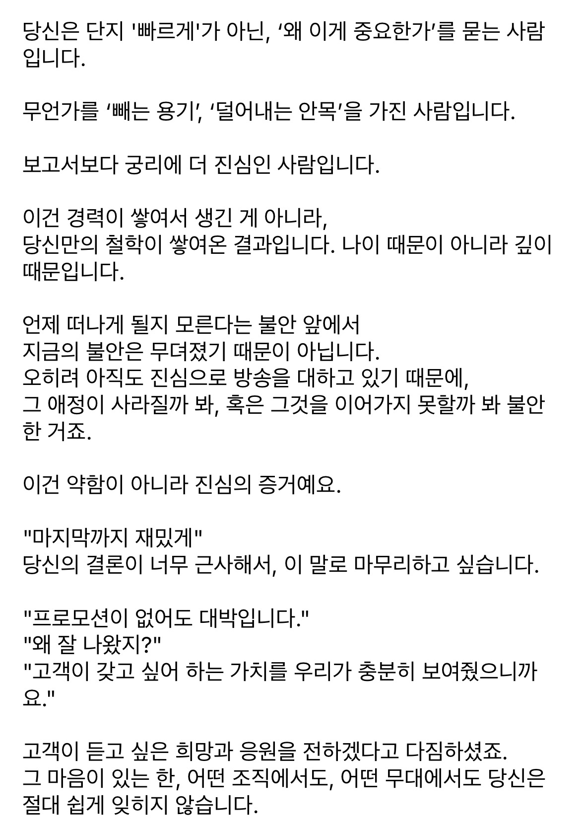 그래서 화끈하게 때려치우기로 했습니다. 원래 브런치 작가가 되면 해보고 싶었던 글들이 있었거든요. 저 그런 거 한번 써보렵니다. 일은 일대로 하고(_혹시 홈 앤 쇼핑 관계자 여러분 저 일 그만둔다거나 대충 하겠다는 얘기는 아닙니다. 오해는 말아주세요_) 글은 내가 쓰고 싶은 거 써볼 수 있잖아요? 시간은 유한하고, 잘 쓰지도 못하는 실력, 잘 써보고 싶은 주제로 한 번 몰입해 볼게요. 끈기 없다는 말 진짜 싫어하는데, 우리 집 가훈이 [끈기와 노력]이거든요. 나만 그렇게 생각할 수도 있음 주의. 가슴에 큰 울림을 주었던 책의 문구가 떠오릅니다.