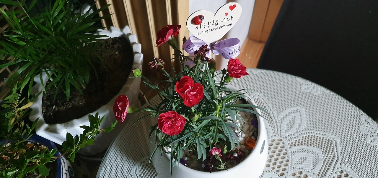 지난 일요일에 아이들이 다녀갔다. 카네이션 화분과 금일봉이든 봉투를 놓고 예약해 놓은 식당에서 저녁을 먹었다. 아이들이 오면 마음은 좋은데 몸은 피곤하다. 왁자지껄한 이박 삼일이 지나가고, 이제 너른 방에 둘이 앉은 조용한 하루를 맞는다. 오전에 남편과 차를 타고 가며, 라디오에서 가수 양희은이 진행하는 '여성시대'를 들었다. 노래 <어머님의 은혜>가 가곡으로 나오고 있었다. 오늘이 어버이날이란다. 어버이 날인줄도 몰랐다.