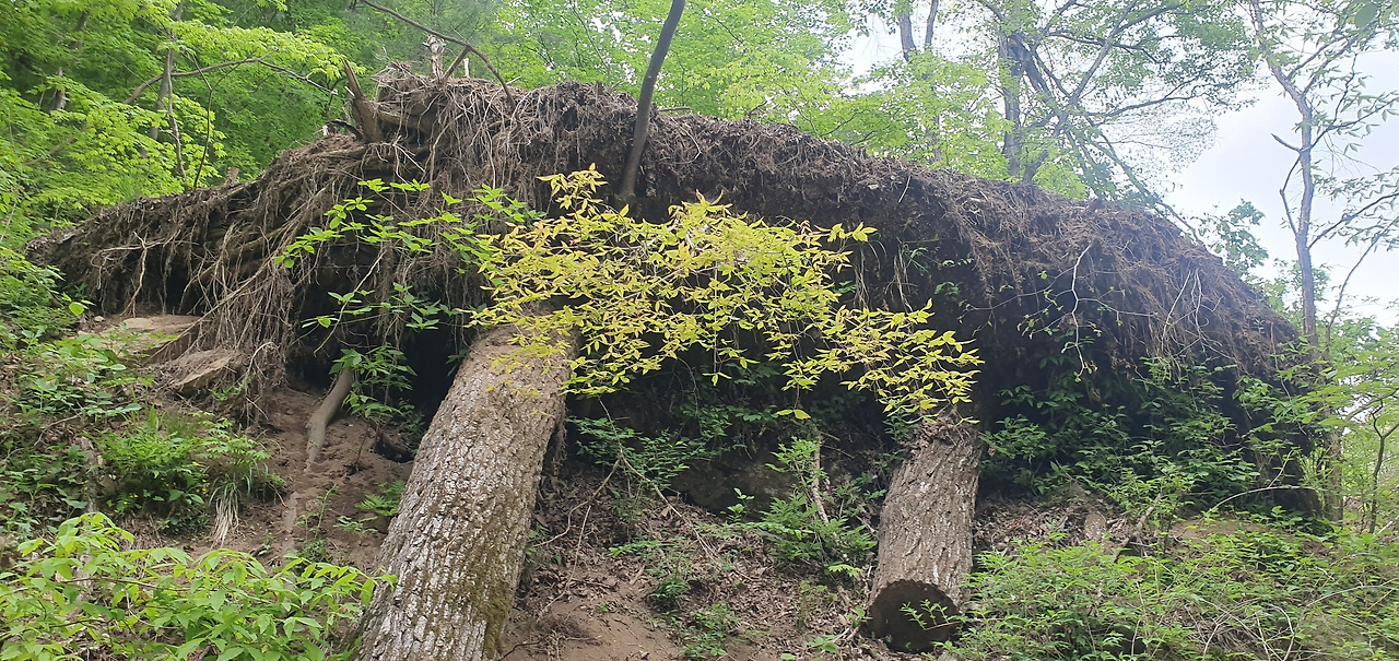 걷다 보니 뿌리가 뽑힌 나무가 보인다. 몇 그루의 나무가 단체로 뽑혀 뿌리가 있는 흙더미를 허공에 두고 있다. 몇 십 년을 자랐을 나무가 맥없이 기운을 놓다니. 홍수 때문에 나무가 뽑혔을 수도 있고, 땅이 얼었다 녹으면서 뽑혔을 수도 있고, 눈사태 때문에 나뭇가지가 무거워져서 나무가 쓰러지며 뽑혔을 수도 있다. 잘 지키고 있던 자기 자리에서 한순간에 나무가 뽑혀나가는 무서운 자연의 현상이다. 사람도 다르지 않다. 어느 순간 예상치 못한 일이 일상을 다 빼앗아 갈 수 있다. 현재의 시간에 언제나 충실해야 한다. 산길도 마찬가지다. 한 걸음의 발자국도 조심히 걸어가자.