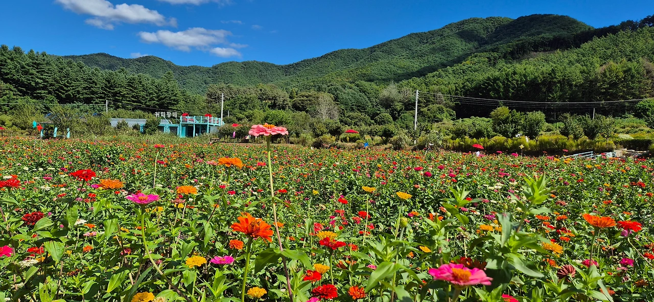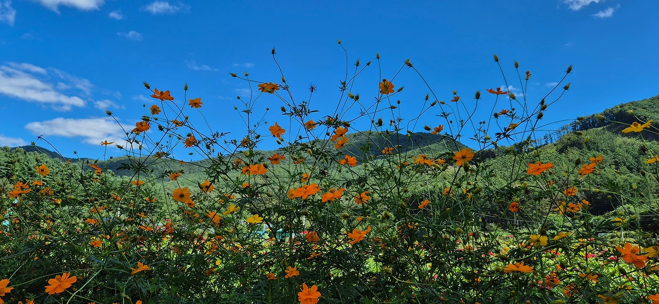 강원도 평창에서 백일홍 축제가 열린다는 소식이 인터넷에 계속 올라온다. 가고 싶지만 9월이 들어서도 계속되는 습도 머금은 무더운 날씨가 계속되니 몸이 더 무거워 외출을 하지 못했다. 예전보다 훨씬 간편해졌지만 가볍게라도 해야 할 일이 있고 손님은 치워야 하니 명절 연휴도 편하지 않다. 명절이 지나니 비까지 내렸다, 올해도 백일홍은 보지 못하겠구나, 생각했었다. 햇살이 보이던 날 아침, 남편이 백일홍 축제를 가잖다. 따라나섰다. 강원도 평창의 평창강변에 백일홍이 가득하다. 전날 많은 비가 내렸음에도 백일홍은 줄기를 굽히지 않았고 절정을 맞은 듯이 활짝 피어있다. 빨간 꽃잎으로 활짝 웃으며 핀 꽃이 평창강 둔치를 가득 메우고 있다, 꽃길을 걸으며 행복하다. 스미트 폰으로 사진을 찍으며 꽃길을 걷다 보니, 백일홍이 이렇게 예쁜 꽃이었나 싶다.
