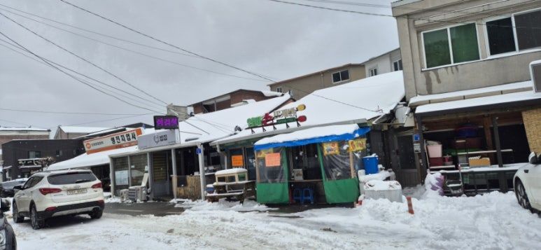 하얀 눈이 덮인 진부 시장. 시골 오일장 구경을 나섰다가 사람 많고 물건 많은 왁자지껄한 장구경은 하지 못했지만 하얗게 눈 덮인 조용한 시장을 한참을 걸었다. 진부장 옆의 초등학교를 바라보면서 어린 시절의 아름다운 추억을 그렸듯이, 이날의 하얀 겨울 풍경도 먼 훗날의 어느 날에는 예쁜 추억으로 기억되길 바라본다.