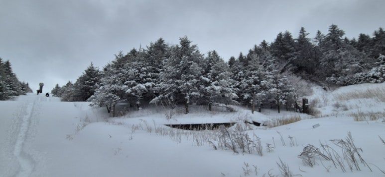 3월에 늦은 눈이 내린 날, 대관령을 갔다가 눈구경도 하지 못하고 주차장에서 차가 눈 속에 빠진 채 움직이지 못해 고생만 했다. 눈이 쌓인 산을 구경도 나서기 전에 몸이 지쳤다. 그러나 눈 쌓인 산 경치가 무척 아름답긴 했다. 추운 날씨라 눈 쌓인 산자락을 배경으로 사진 몇 장 찍고 진부로 나가 늦은 점심을 먹었다. 점심을 먹고 식당 옆의 진부장에 나갔다.